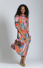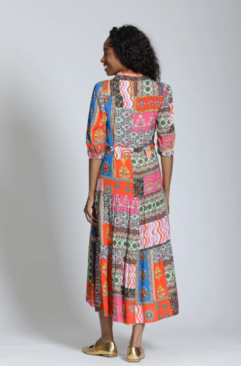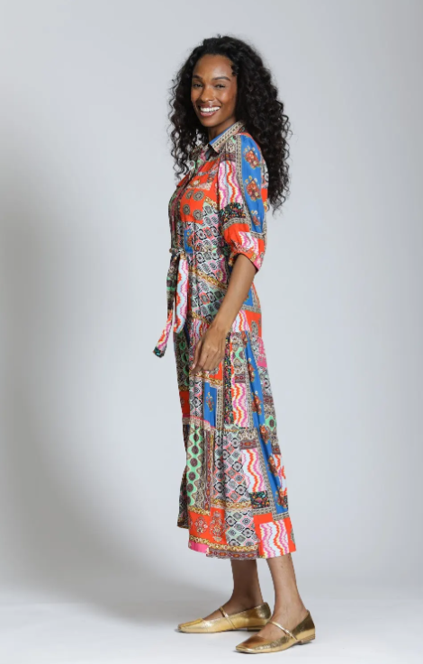 This vibrant shirt dress is a true statement piece, blending bold color with effortless wearability. Designed in a rich patchwork of mixed prints, it features a classic collared neckline and button-front bodice that keep the look polished while letting the pattern shine. The adjustable self-tie waist cinches comfortably to define your shape, and the short sleeves add an easy, versatile feel. Flowing into a tiered midi skirt with pockets, the silhouette moves beautifully with every step, giving it that carefree yet put-together vibe. Lightweight and breathable, it’s the kind of dress that works just as well for daytime outings as it does for dinners out—simply switch your shoes and accessories to change the mood.