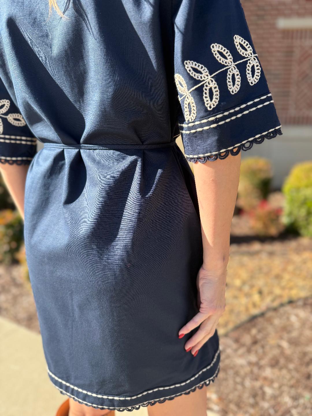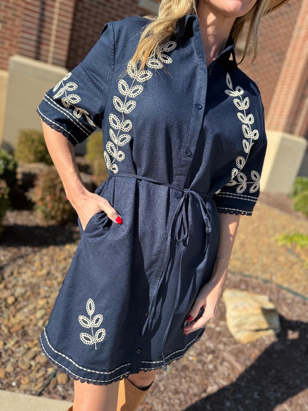 This navy linen shirt dress blends timeless tailoring with thoughtful detail. Crafted in breathable linen, it features delicate cream embroidery throughout, highlighting the sleeves, front panels, and hem for an elevated, artisan feel. The short sleeves are finished with subtle scalloped trim, while the button-front silhouette is softened by a removable self-tie belt that cinches the waist just right. Side pockets add everyday ease, and the relaxed skirt creates an effortlessly flattering shape. Easy to dress up or down, this is a polished yet wearable piece you’ll reach for season after season.