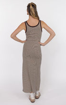 Sporty meets sleek in the One and Only Striped Knit Dress by Sage the Label. This fitted tank-style maxi features a soft, medium weight knit with tan, black and slate gray stripes, contrast chocolate brown trim, and side seam piping for a flattering, elongating effect. The side slit adds just the right amount of edge, while the stretchy fabric hugs in all the right places. Effortlessly cool with sneakers or dressed up with booties — it’s your go-to for casual days or nights out. Moving into fall, layer with your favorite denim jacket.