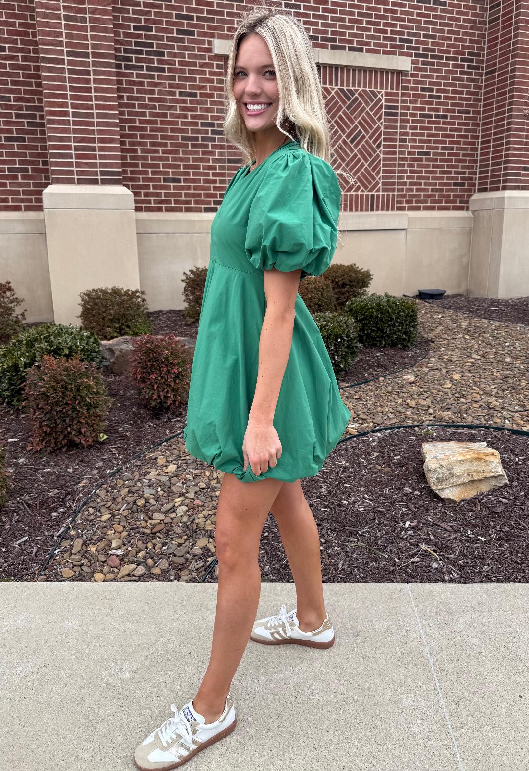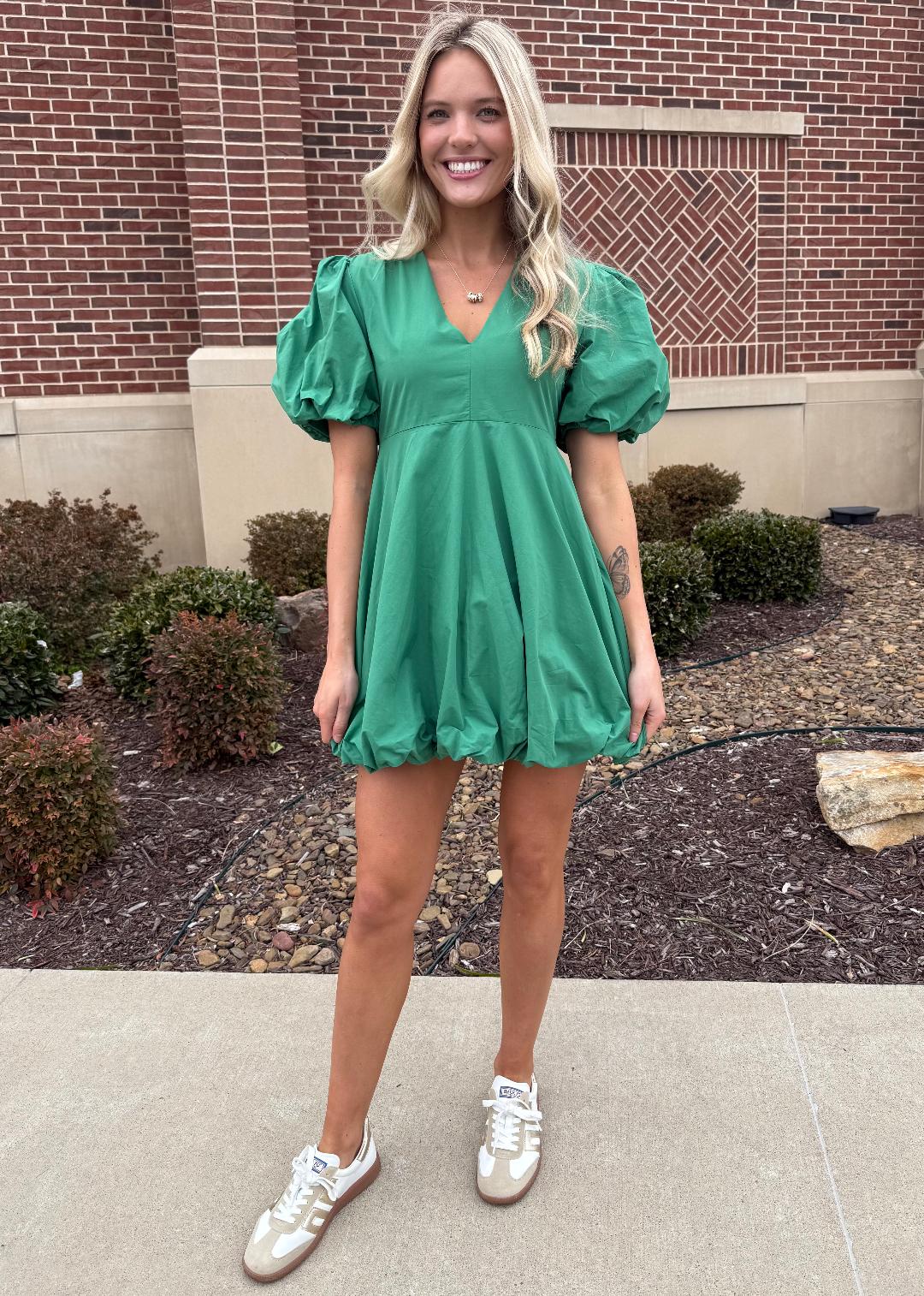 This playful bubble-hem dress is a total statement piece with an easy, flattering fit. Designed with a soft V-neckline and airy short puff sleeves, it features a gently structured bodice that flows into a voluminous skirt with a playful bubble hem for that modern, fashion-forward silhouette. The lightweight woven fabric keeps it comfortable and breathable, while the mini length makes it perfect for everything from daytime events to casual nights out. Style it with sneakers for a laid-back vibe or dress it up with sandals or heels for a polished look.