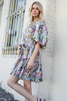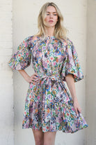 A feminine, statement-making mini dress designed in a vibrant multicolor floral print that feels both fresh and artful. It features soft puff sleeves with a relaxed drape, balanced by a structured bodice detailed with clusters of delicate button closures down the front. The self-tie belt cinches the waist for a flattering shape, while the tiered skirt adds movement and a playful, flirty finish. Lightweight with an easy flow, this piece is perfect for dressing up or styling more casually with a change of shoes.