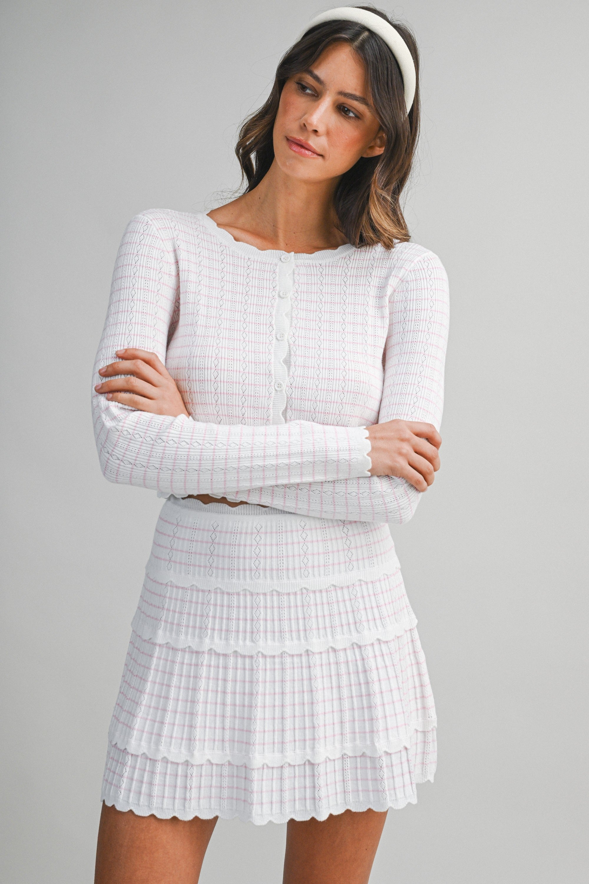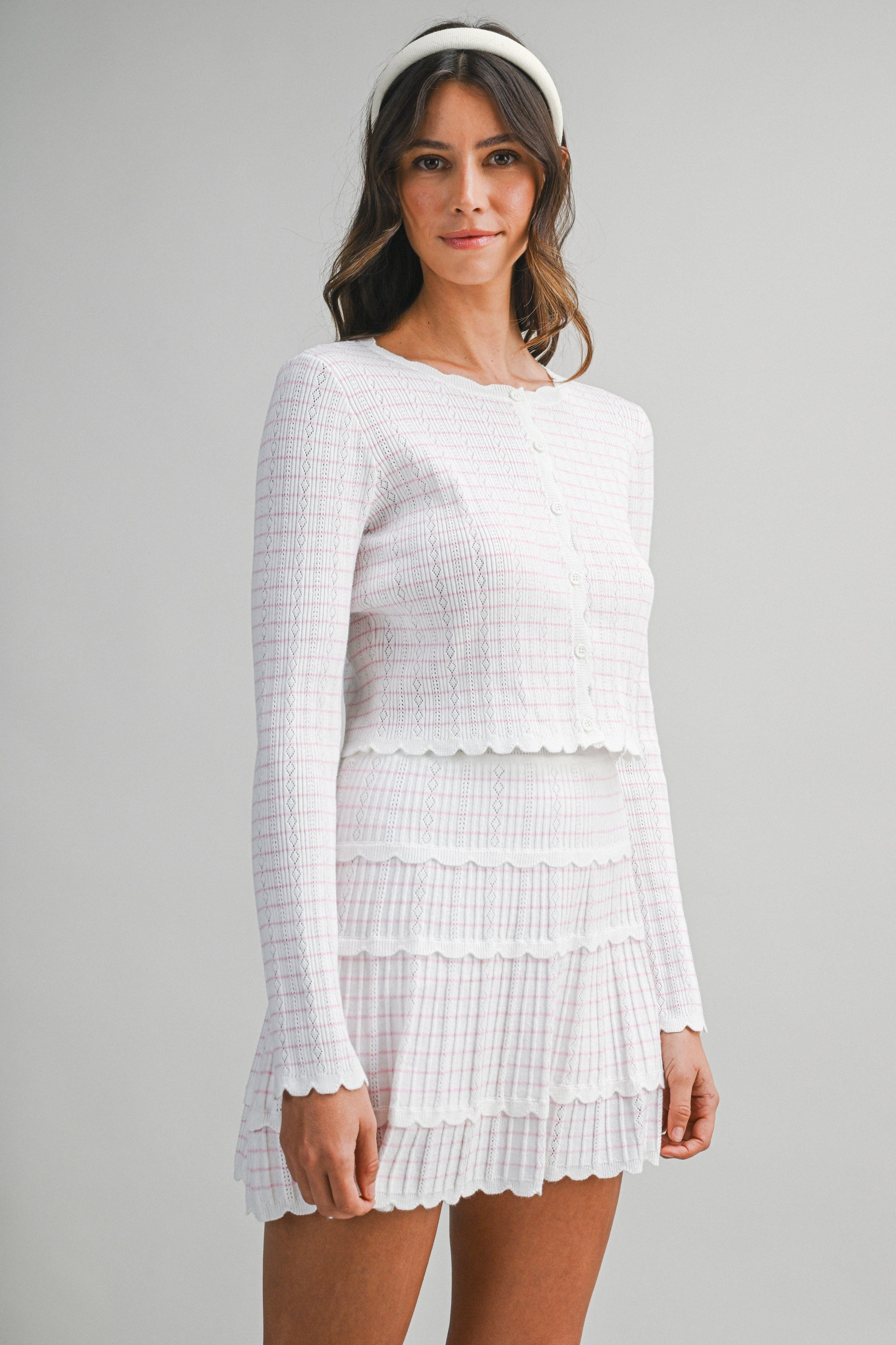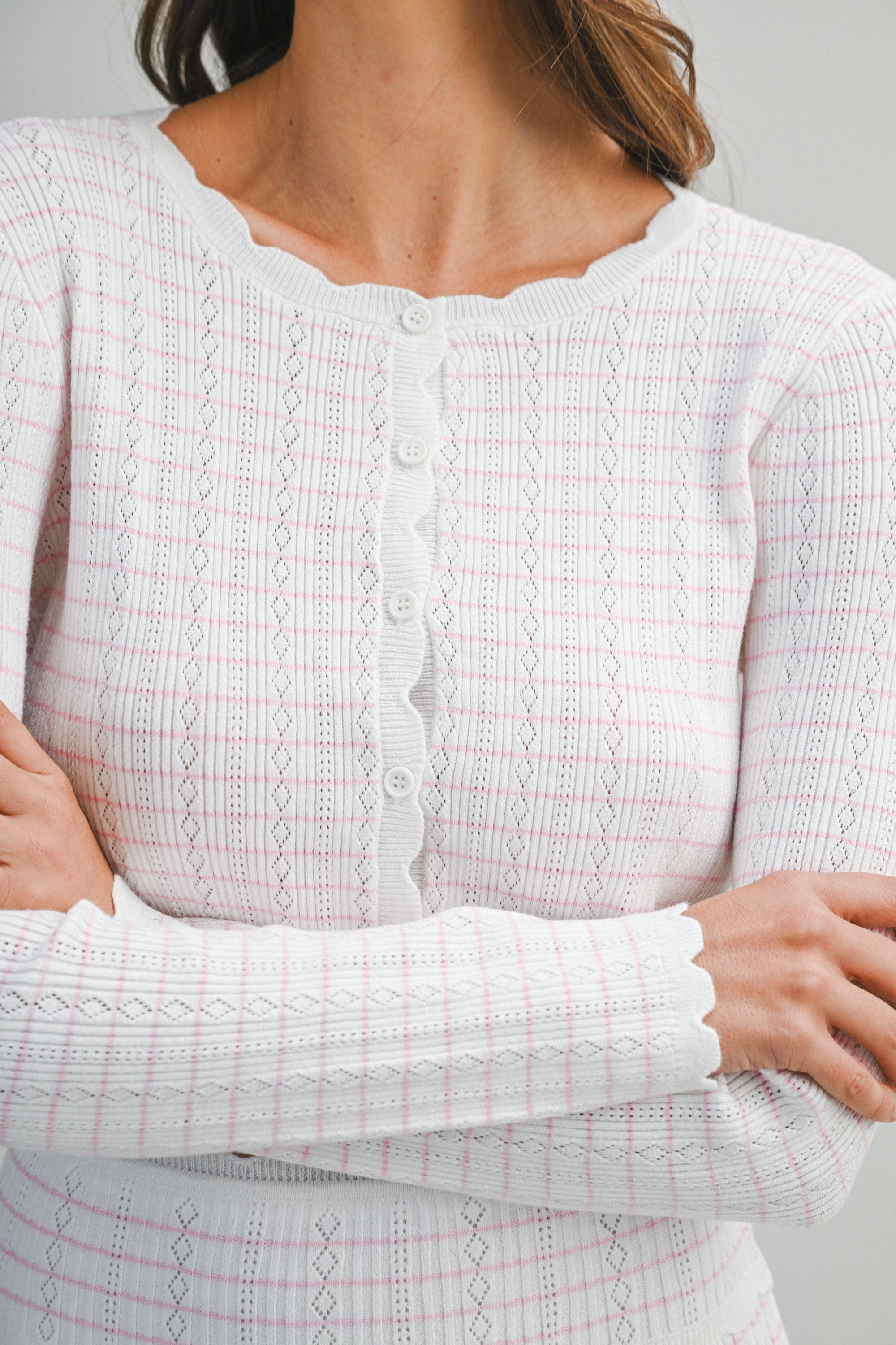 This sweet, feminine knit set brings together delicate detail and effortless wearability. The long sleeve cardigan is crafted in a soft pointelle knit with subtle striped detailing throughout, finished with a classic button-front closure and scalloped edges that add a romantic touch. The lightweight knit has a flattering, close-to-body fit that feels polished yet comfortable.
