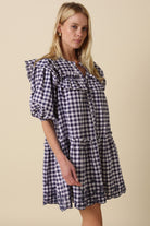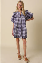 This gingham mini dress is a charming blend of classic pattern and feminine detail. Crafted from lightweight woven cotton, it features a soft navy-and-white check that feels timeless yet fresh. Ruffled accents frame the shoulders and chest, adding subtle structure and a romantic touch, while short puff sleeves with gentle gathering create an easy, flattering shape. The button-front bodice leads into a relaxed, tiered skirt with pockets that moves beautifully and keeps the fit comfortable without feeling oversized. Delicate embroidery along the hemline adds a refined finish, giving this everyday dress a little something extra. Easy to wear with sandals, wedges, sneakers, or even western boots, it’s the kind of piece that works for brunch, casual outings, or warm-weather events with minimal styling.
