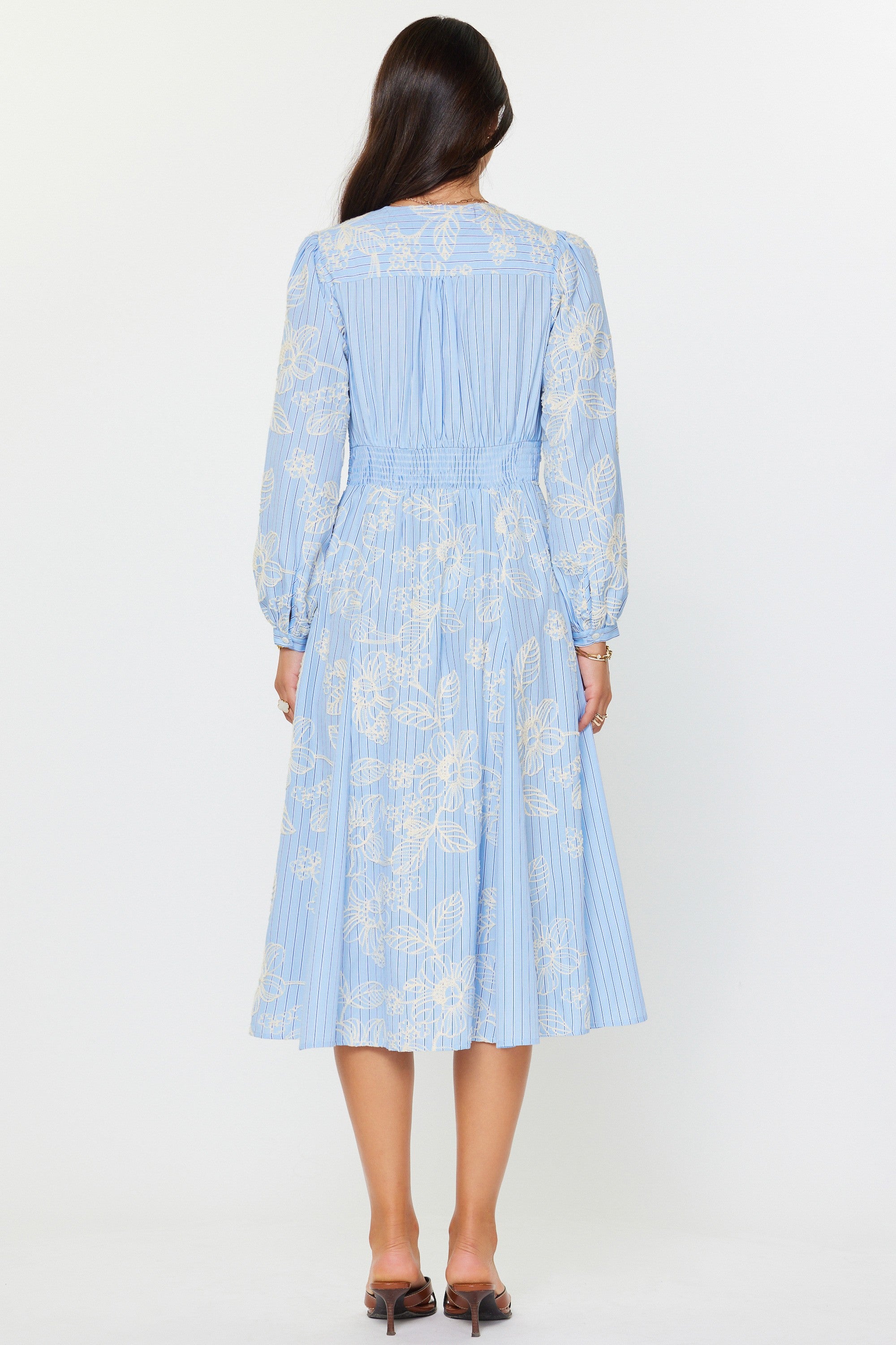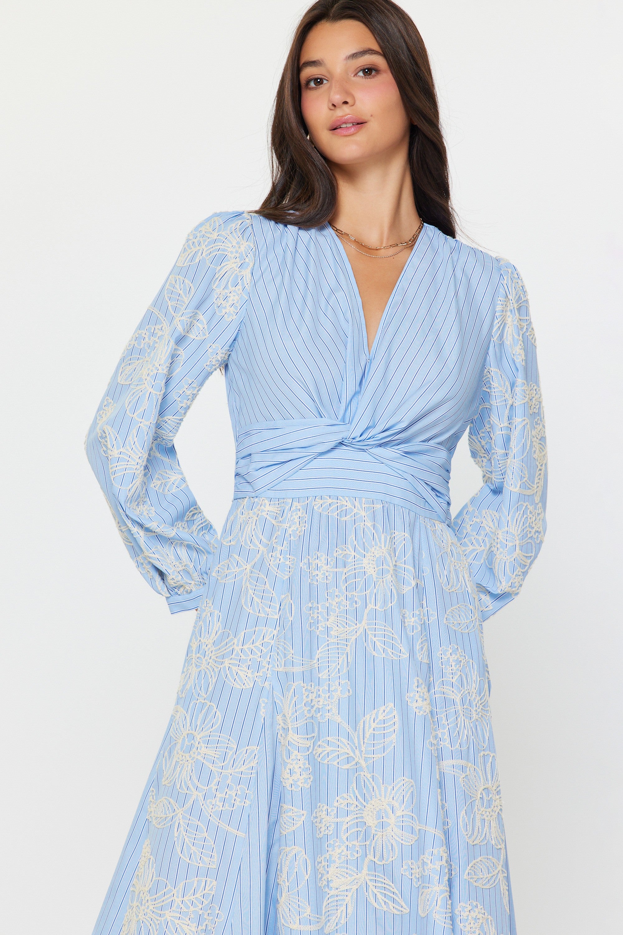 This dress features a soft light blue base with delicate vertical pinstripes and an embroidered floral overlay that adds dimension and femininity. The bodice is designed with a flattering wrap-style V neckline and a gently twisted waist detail that defines the silhouette without feeling restrictive. Long sleeves offer subtle volume and are finished with embroidered detailing for an elevated touch. The skirt has pockets and flows into an easy A-line midi length, creating graceful movement with every step. Lightweight and breathable, this dress is polished yet comfortable, making it ideal for spring events, work, showers, brunches, or any occasion that calls for effortless elegance.