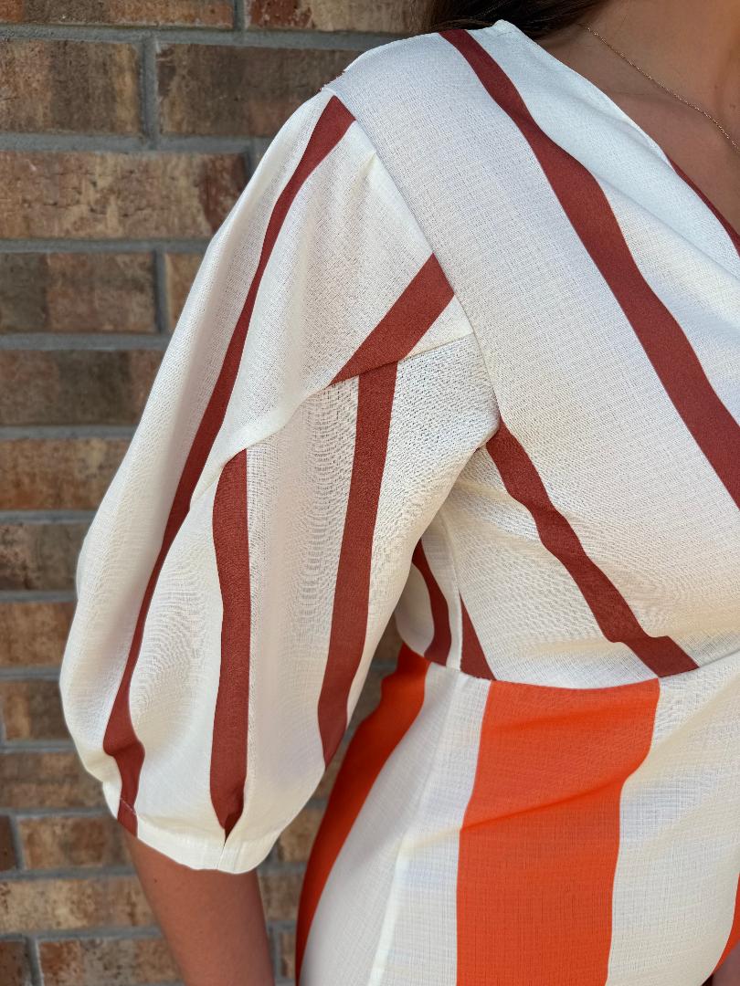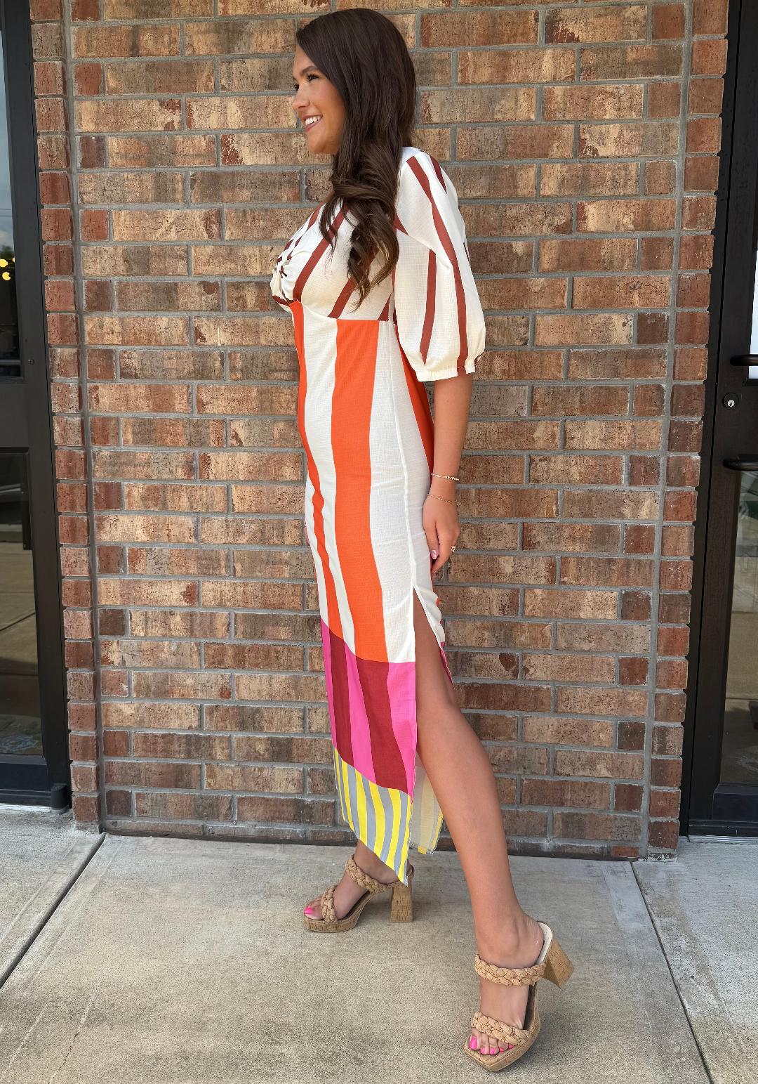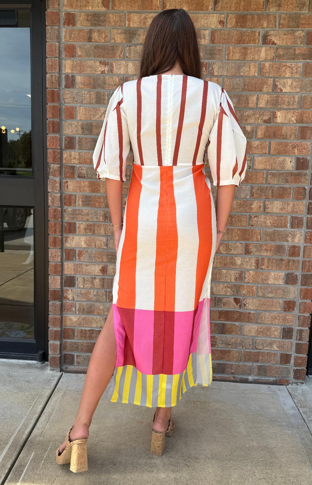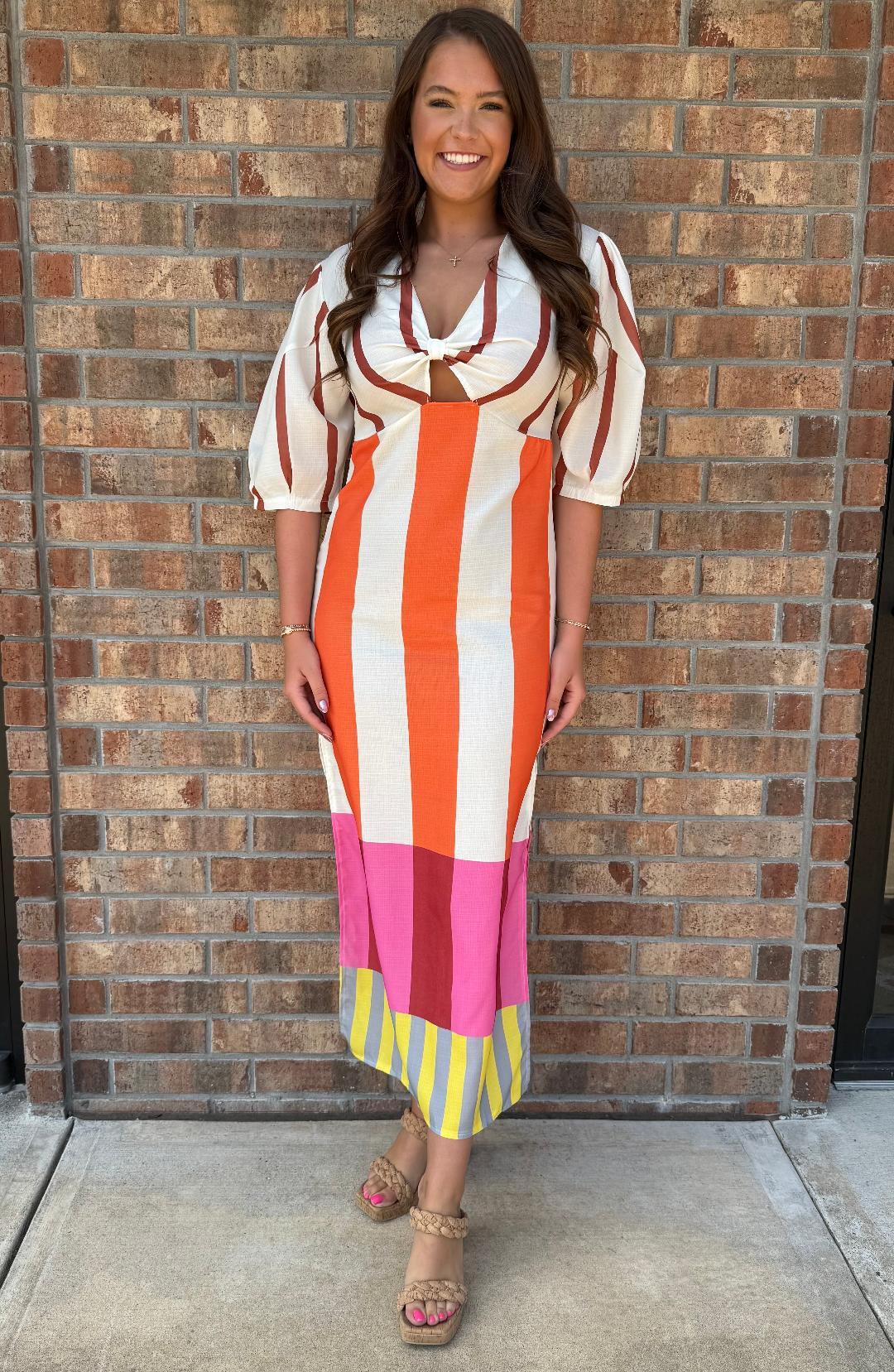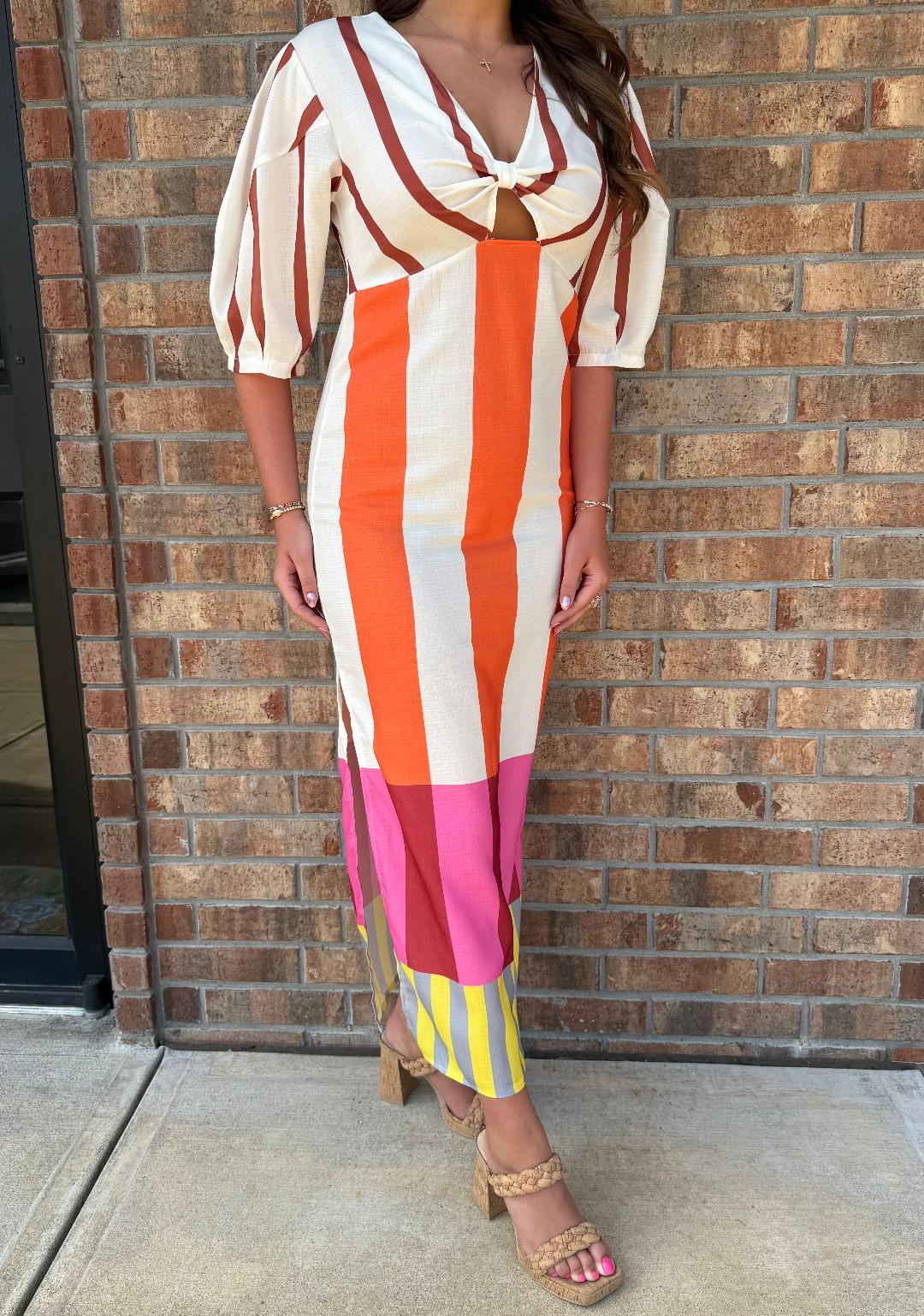A total designer dupe—without the splurge. This colorful striped midi dress turns heads with its bold palette and flattering silhouette. Featuring puff sleeves, a twist-front bust with a peekaboo cutout, and a side slit for a little extra sass, it's perfect for warm-weather events or vacation moments. The mix of vibrant rust, orange, pink, and yellow stripes gives it that high-end, editorial feel—at a price you'll love.