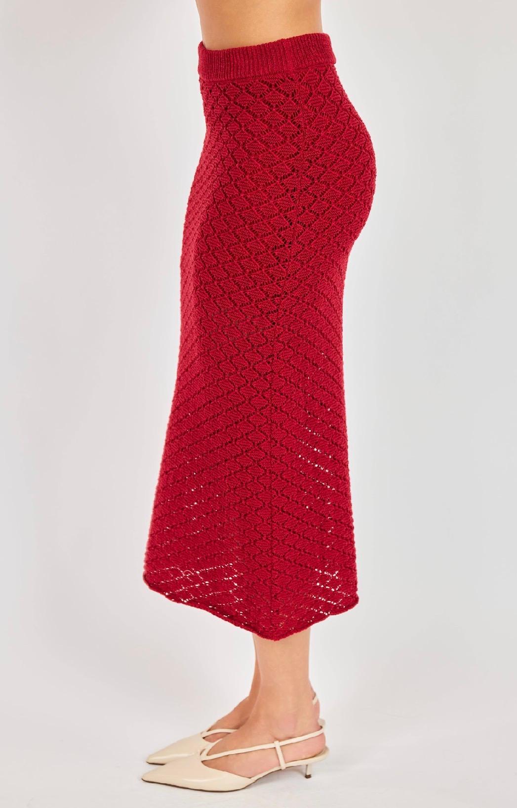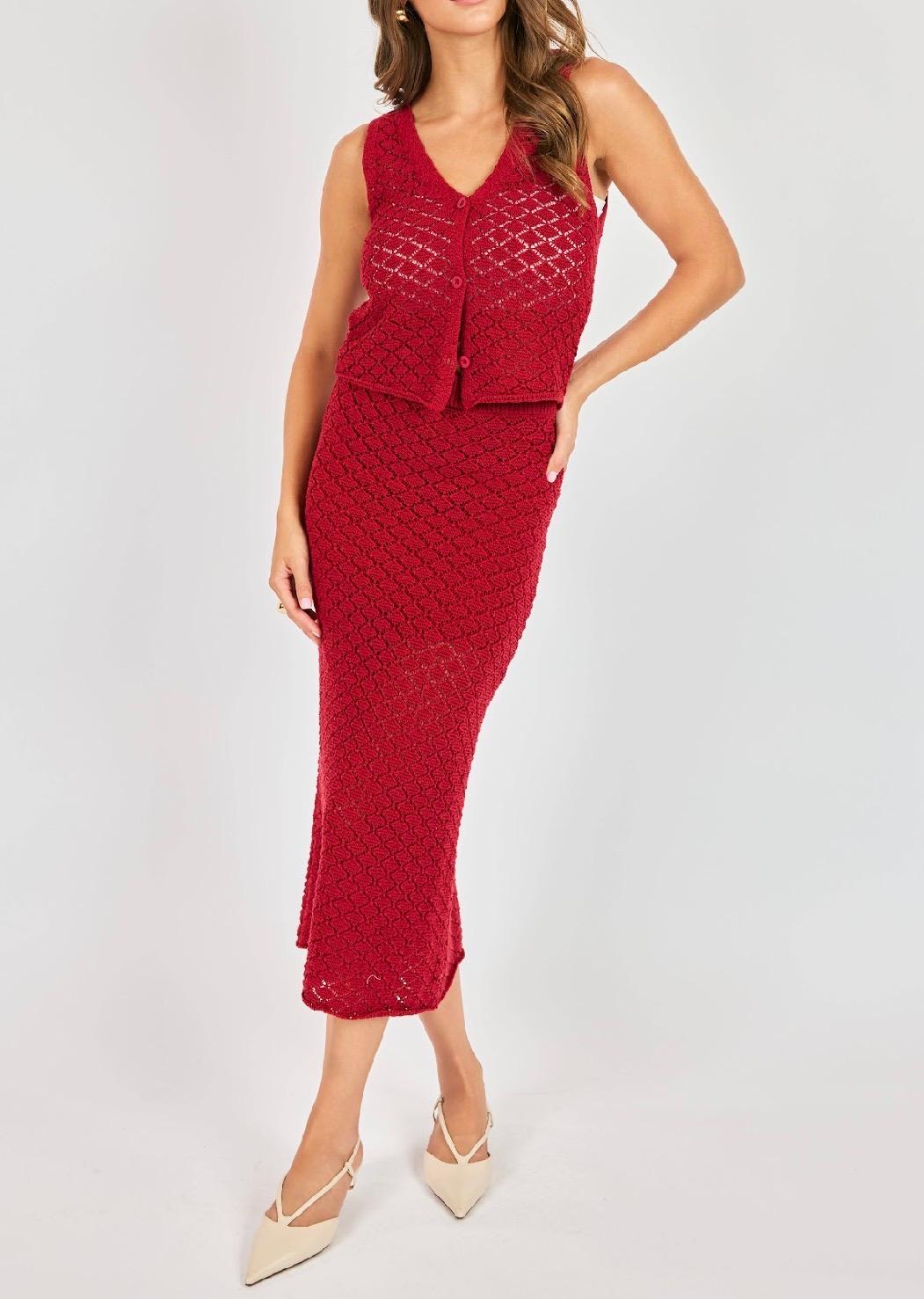 This midi skirt showcases the same beautiful textured open-knit pattern as its matching cardi vest for a cohesive, elevated look. Designed with a comfortable elastic waistband and a figure-skimming silhouette, it gently flares toward the hem for graceful movement. The skirt is lined to mid thigh for coverage while still allowing the intricate knit design to shine through. Falling at a midi length, it’s polished yet versatile — easy to dress up with heels or keep more casual with a simple sandal. Switch it up and pair it back to a simple tee.