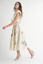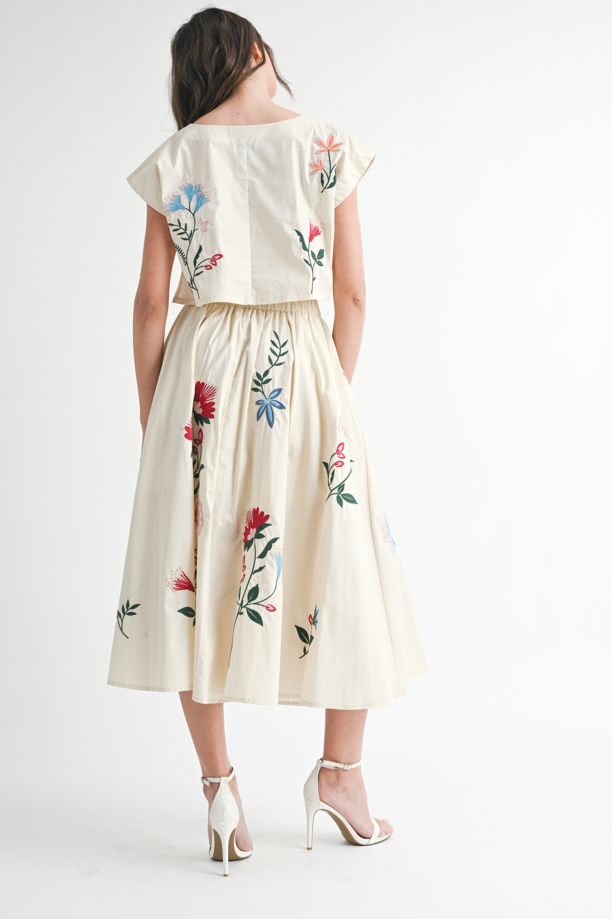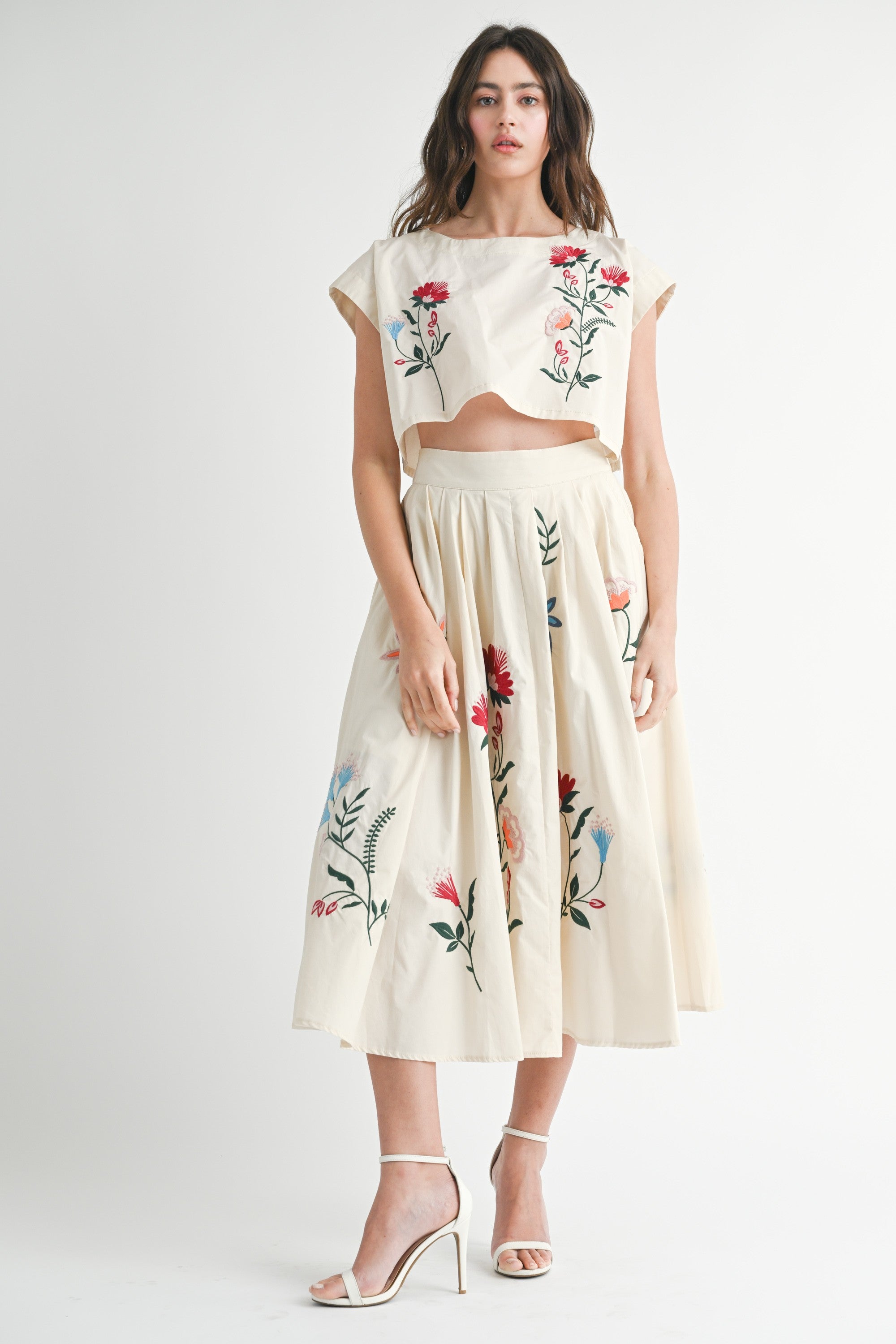 Romantic, whimsical, and effortlessly elegant — the Wildflower Waltz Set is your new go-to for summer soirées and weekend getaways. This two-piece set features a structured cap-sleeve crop top and a full midi skirt, both crafted from a lightweight fabric and adorned with vibrant floral embroidery. With its flattering high-waist silhouette, soft pleating, and side pockets for ease, this look strikes the perfect balance between boho charm and timeless polish. Pair it with heels or sandals for a garden-party-ready look. SOLD AS A SET.