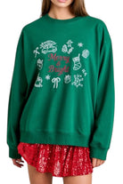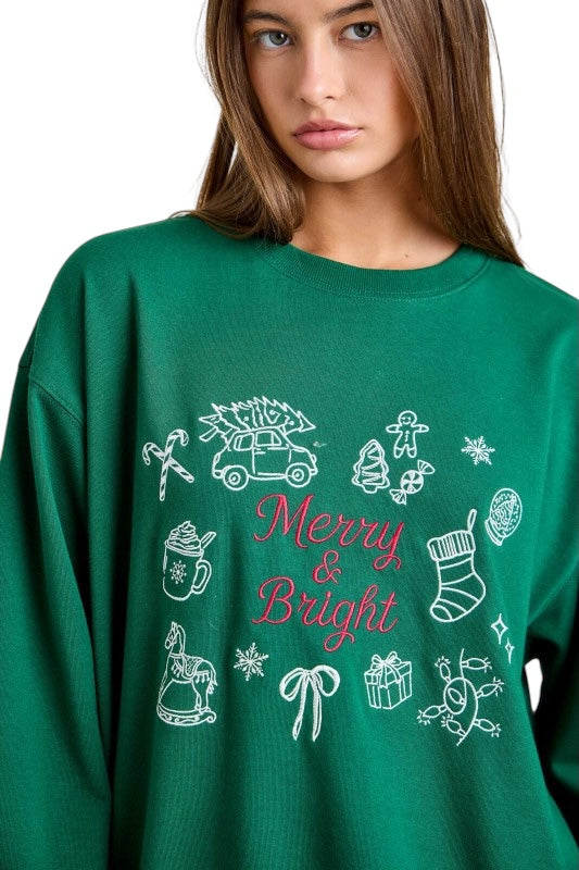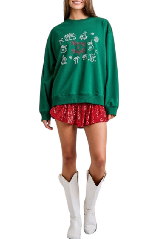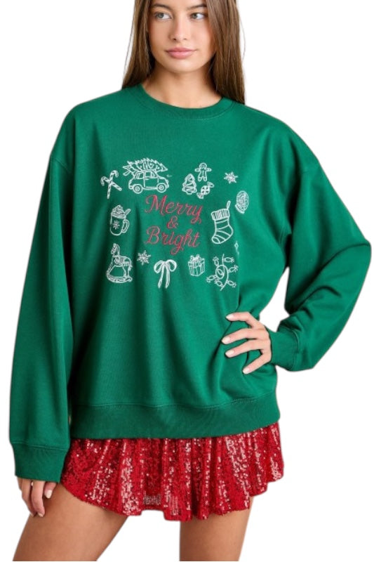 Celebrate the season in style with this festive green sweatshirt. Featuring cheerful holiday doodles and a bold “merry and bright” embroidery. It’s cozy, playful and perfect for Christmas gatherings, holiday parties or gifting.