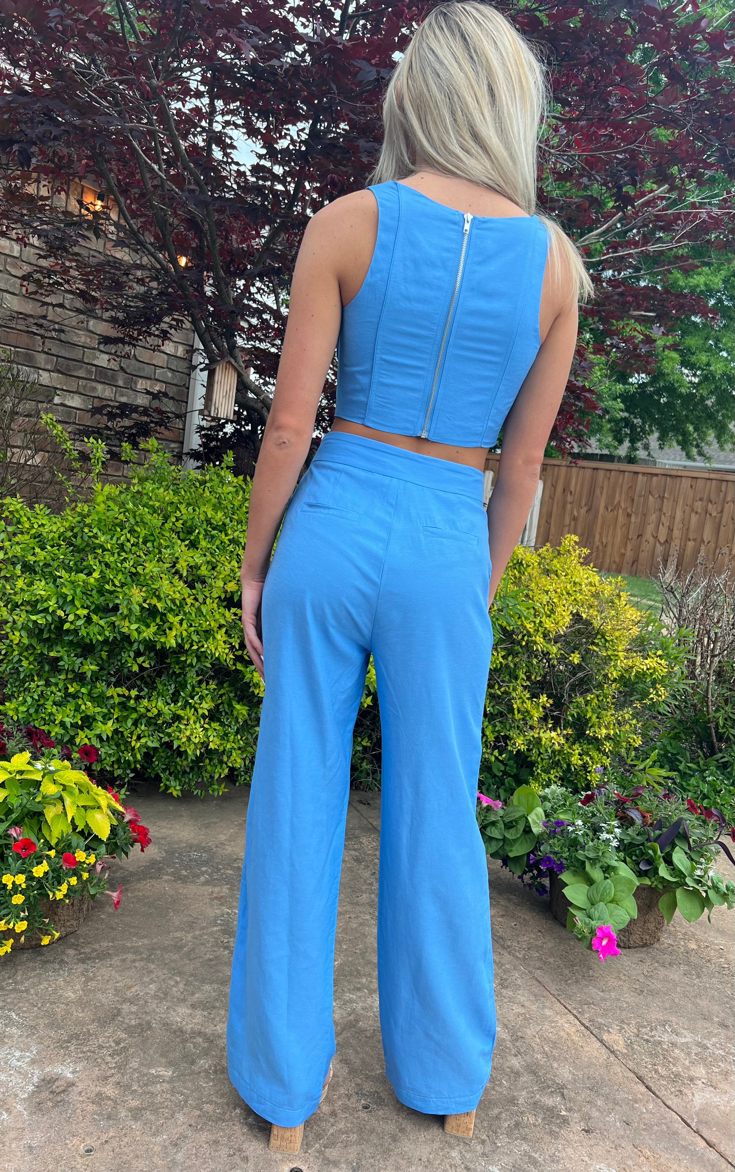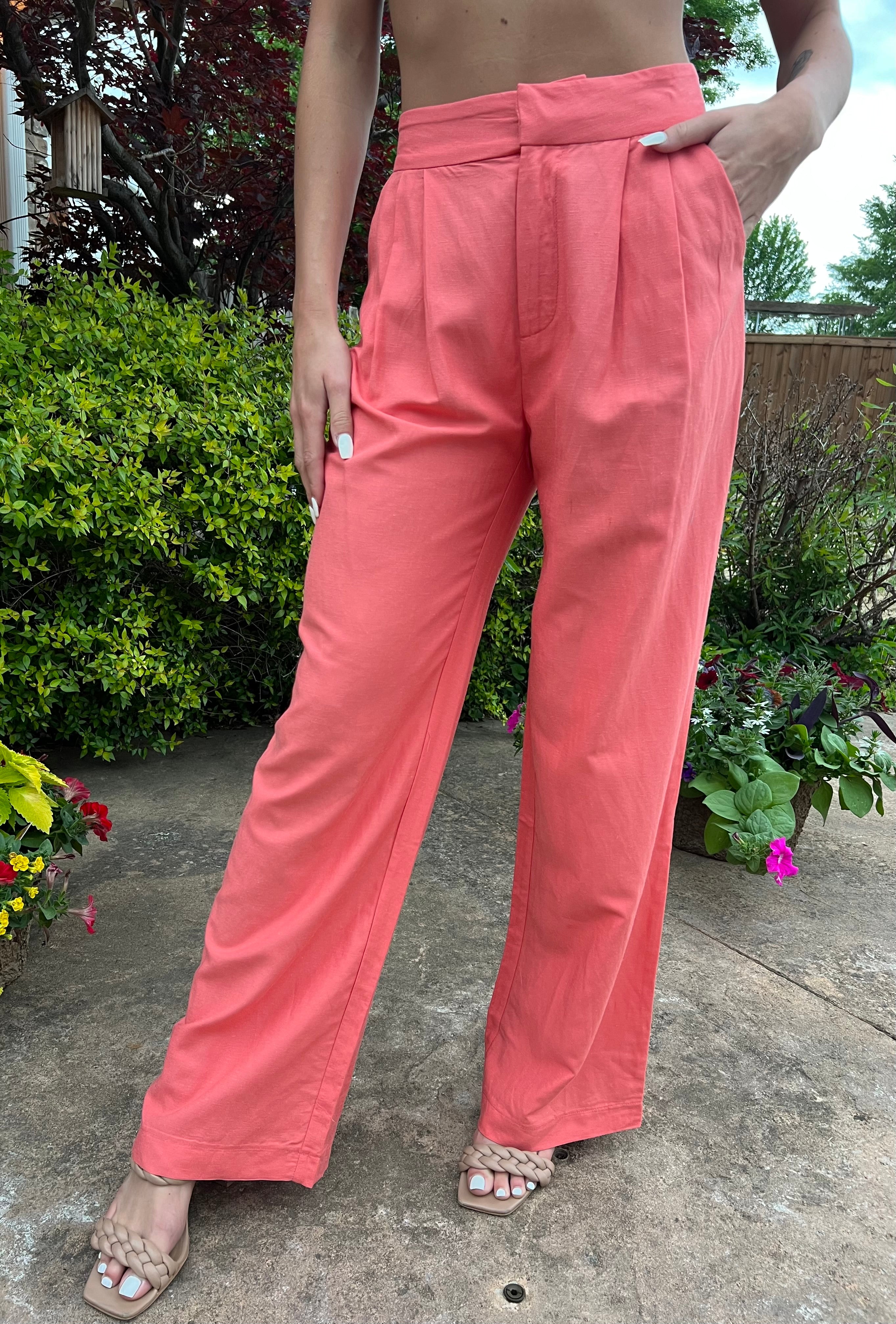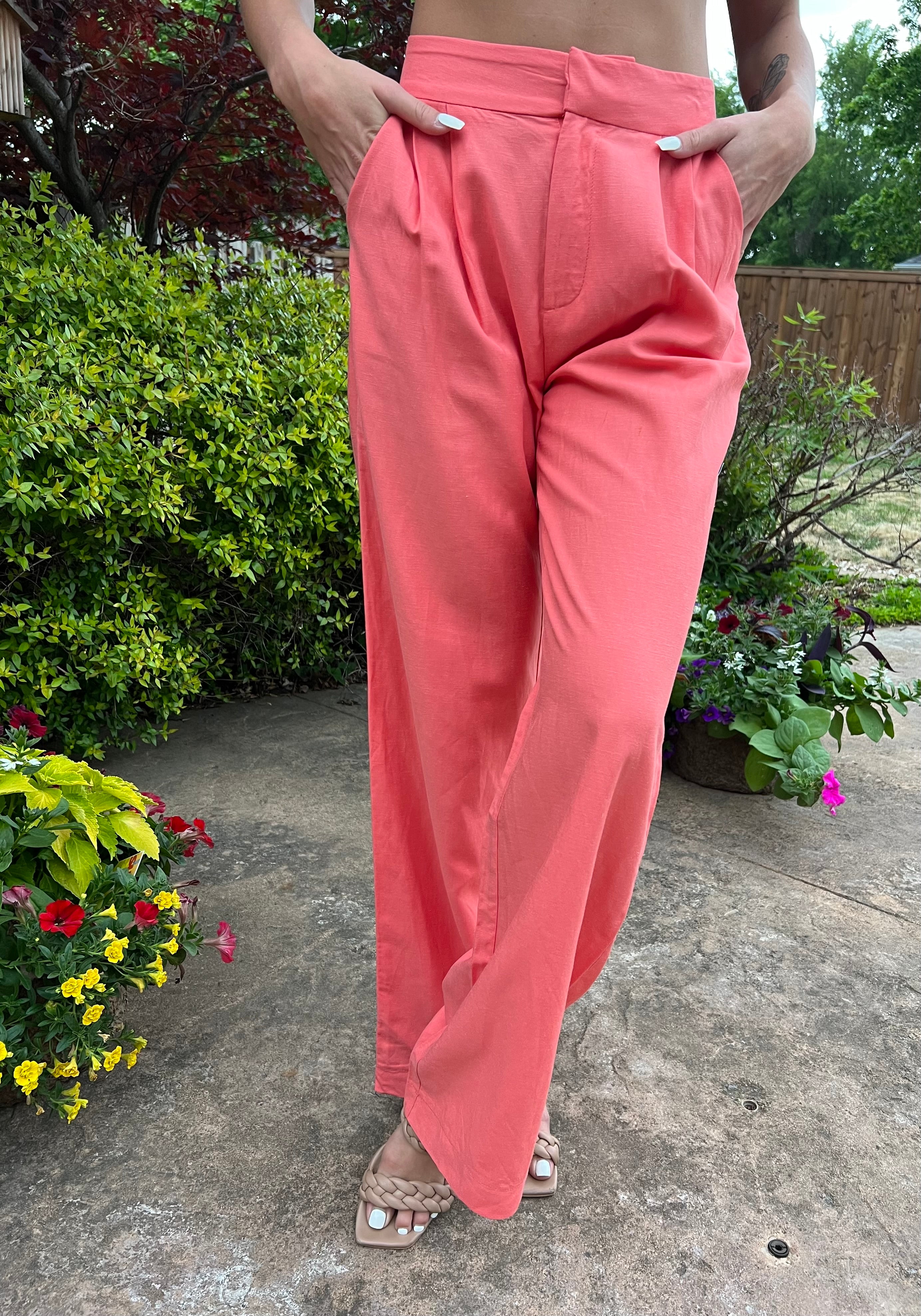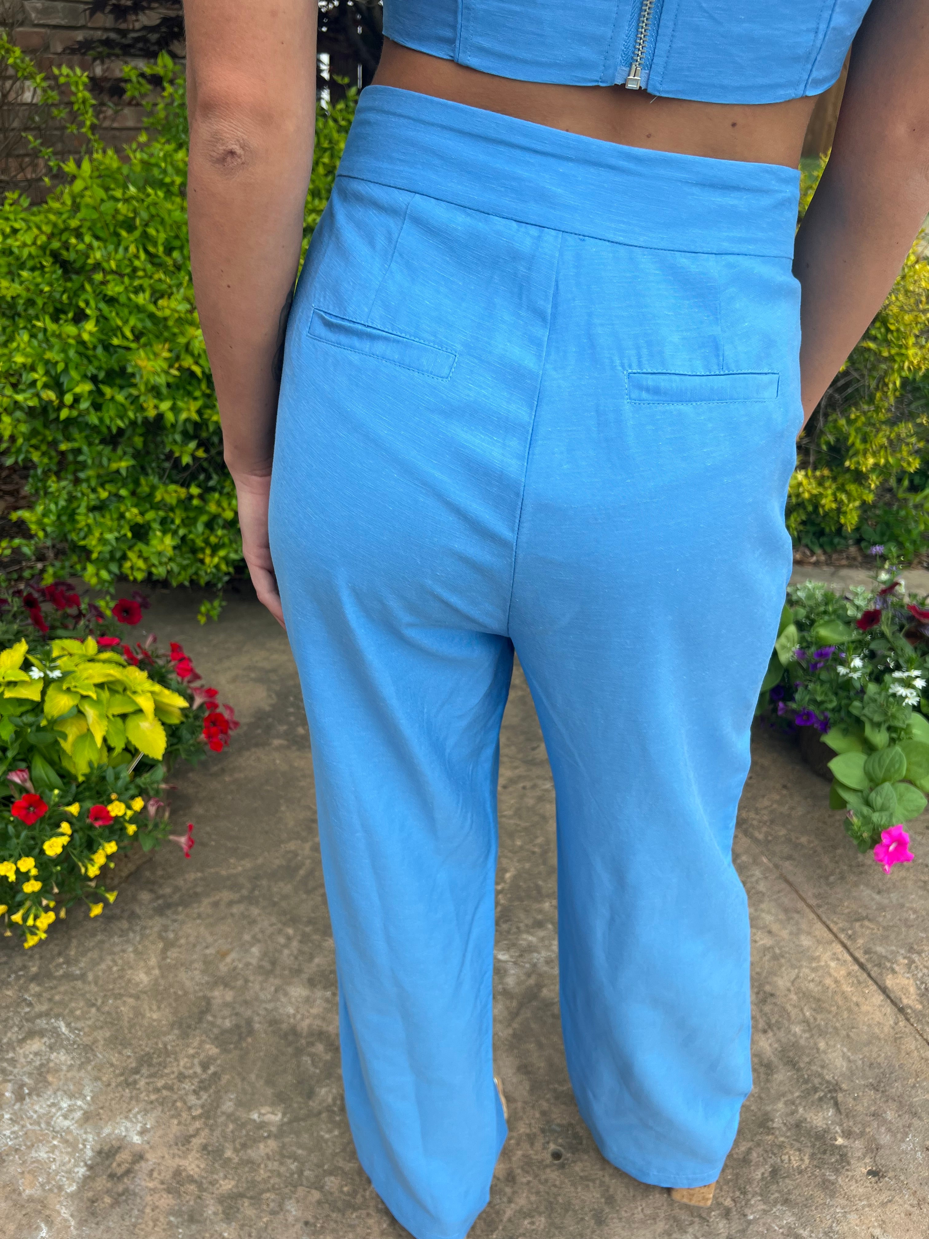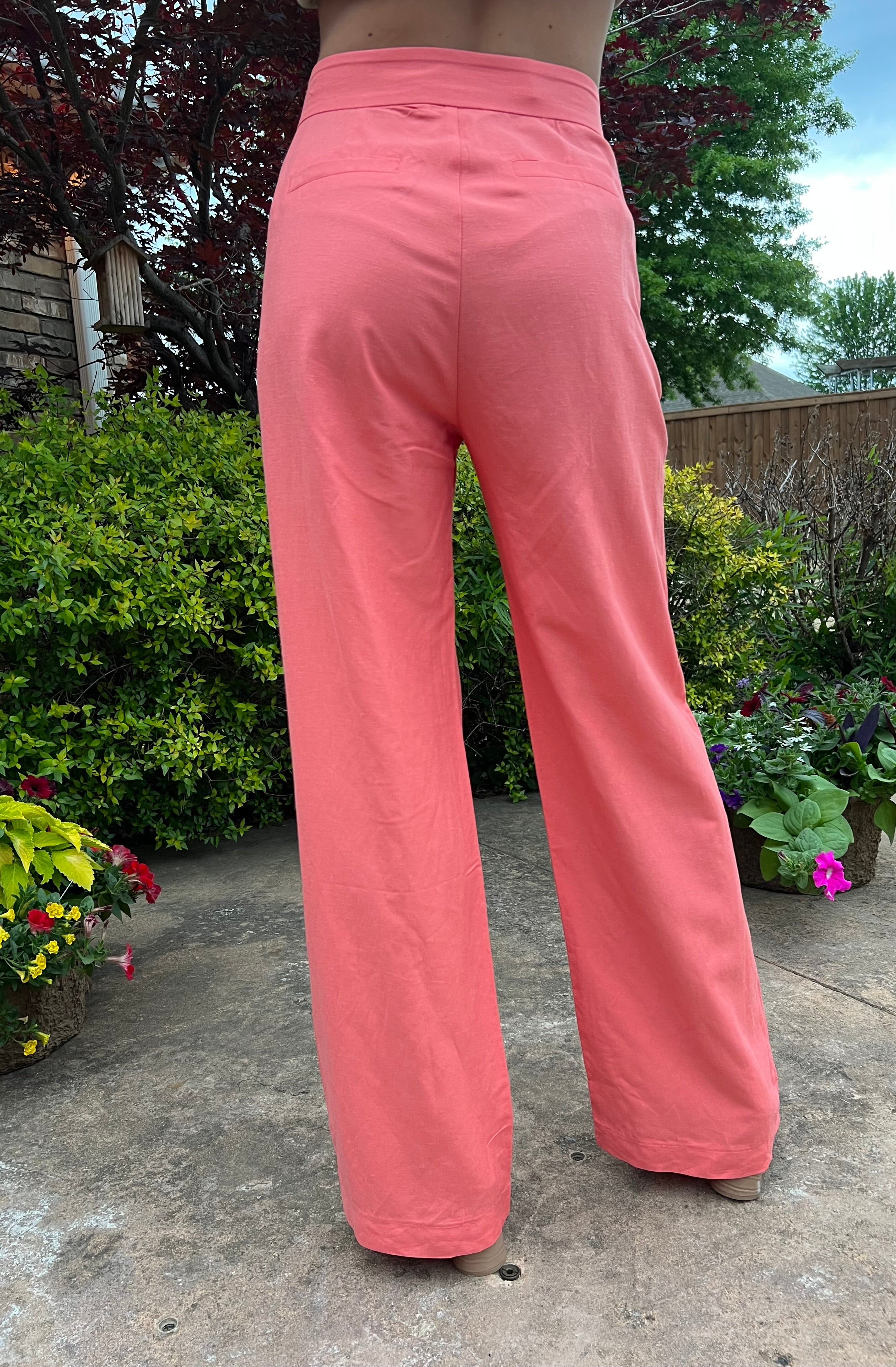 A high waistband and front pleating contribute to the overall tailored look of the ISABELLA wide leg pant. Offered in a gorgeous shade of blue and coral. The blue pant has a matching top HERE. For a crisp, white top try THIS ONE!
