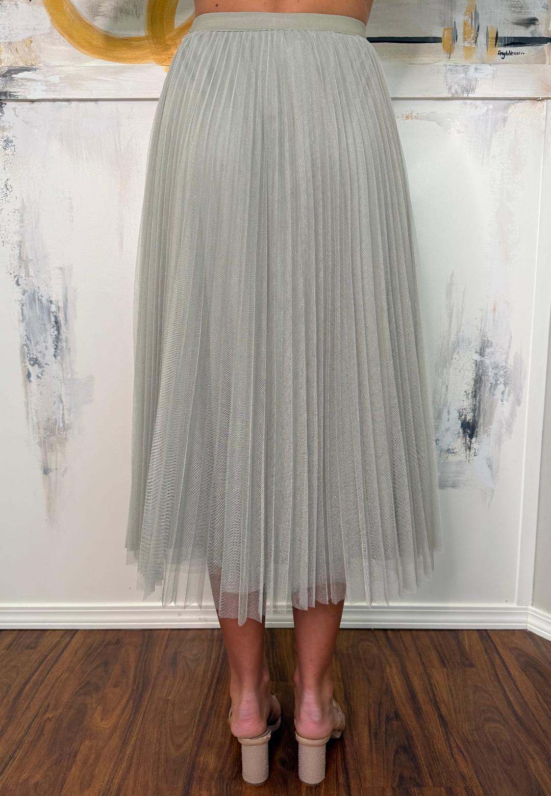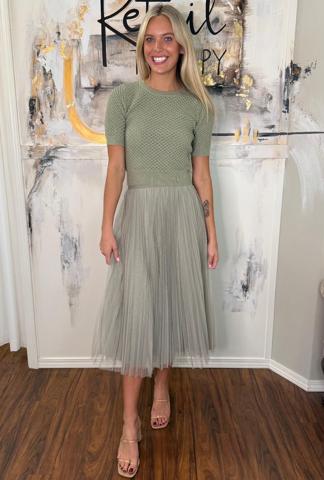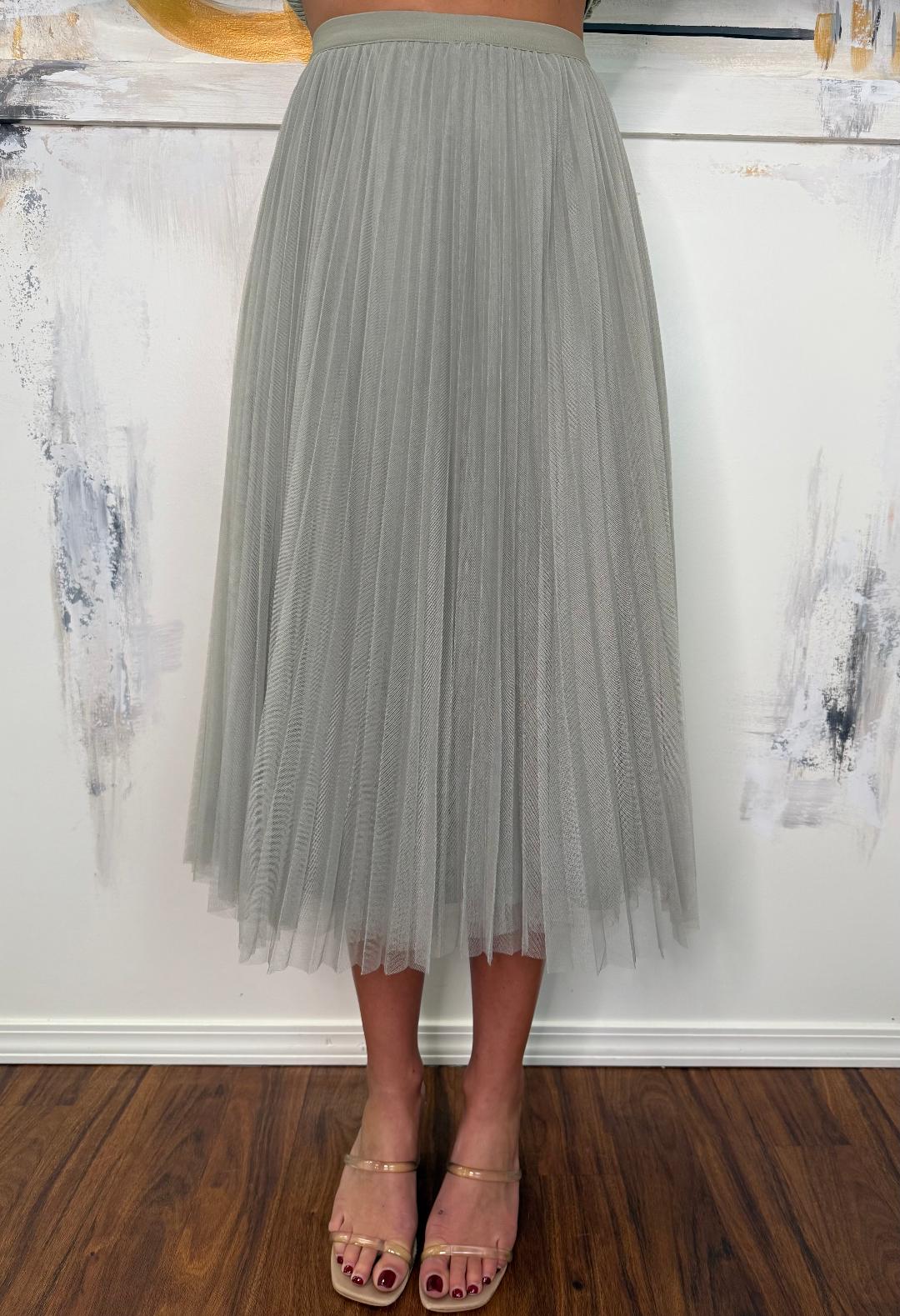 A fashionista's dream skirt. Feel feminine and beautiful in this pull-on elastic waist pleated tulle midi skirt in a soft sage green shade. We love it paired with the coordinating Elise Knit Top but have fun styling this versatile skirt many ways!