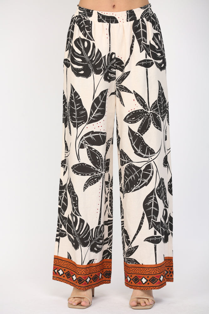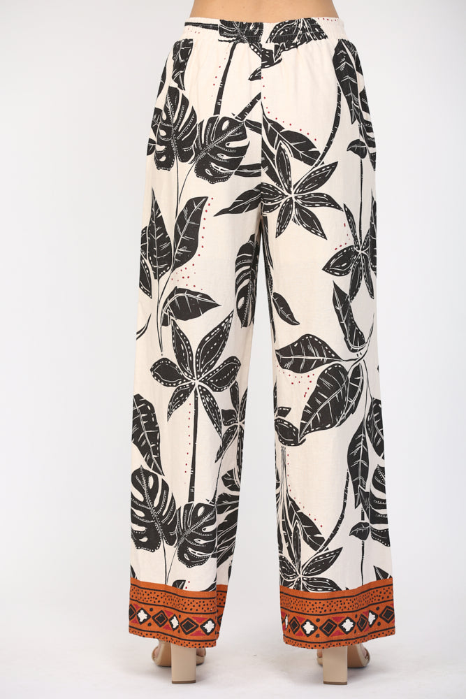 Turn heads in this effortlessly chic two-piece ensemble, perfect for warm-weather getaways or casual summer days. These wide-leg pants, crafted from an airy linen-blend fabric, offer both comfort and elegance. The elastic waistband ensures a flattering fit, while the all-over tropical leaf pattern pairs seamlessly with the matching top. A striking burnt orange and black geometric border at the hem adds a pop of color and artistic flair. Wear as a matching set or mix and match with solid tops for versatile looks.