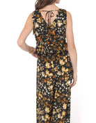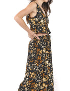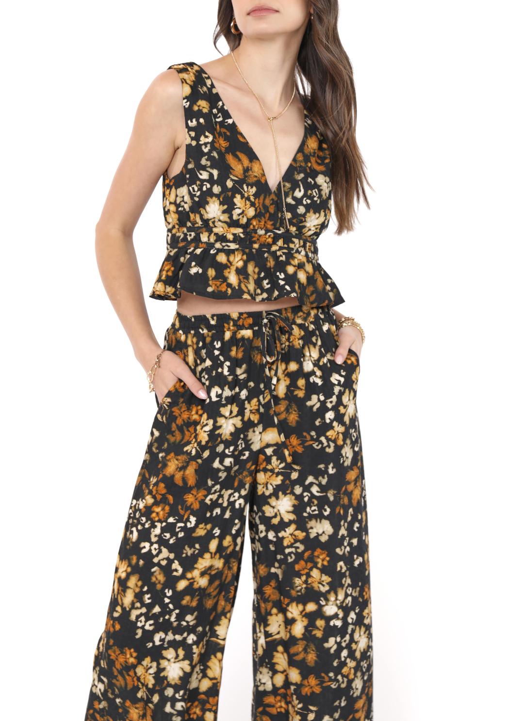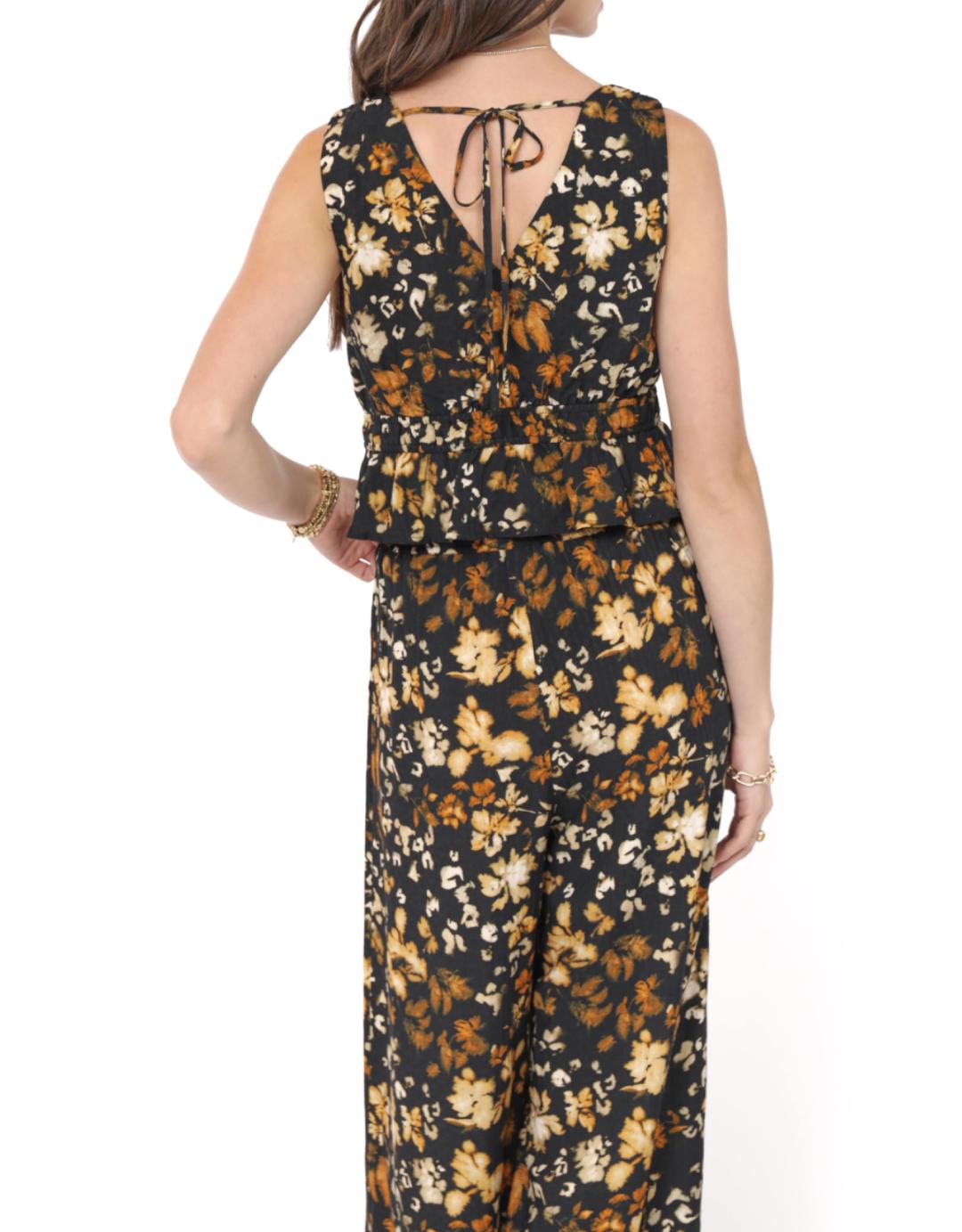 This sleeveless peplum top features a flattering V-neckline in both the front and back, finished with a delicate tie detail at the back for added femininity. The fitted waistline flares into a ruffled peplum hem, creating a figure-enhancing silhouette. Its black base is decorated with a marigold floral (and cheetah) print in golden, rust, and cream tones—perfect for transitioning seasons. The cropped length makes it an easy match with the With Ease Pant, skirts, or denim. Layer with one of our cardigans, blazer or leather jacket in cooler temps!
