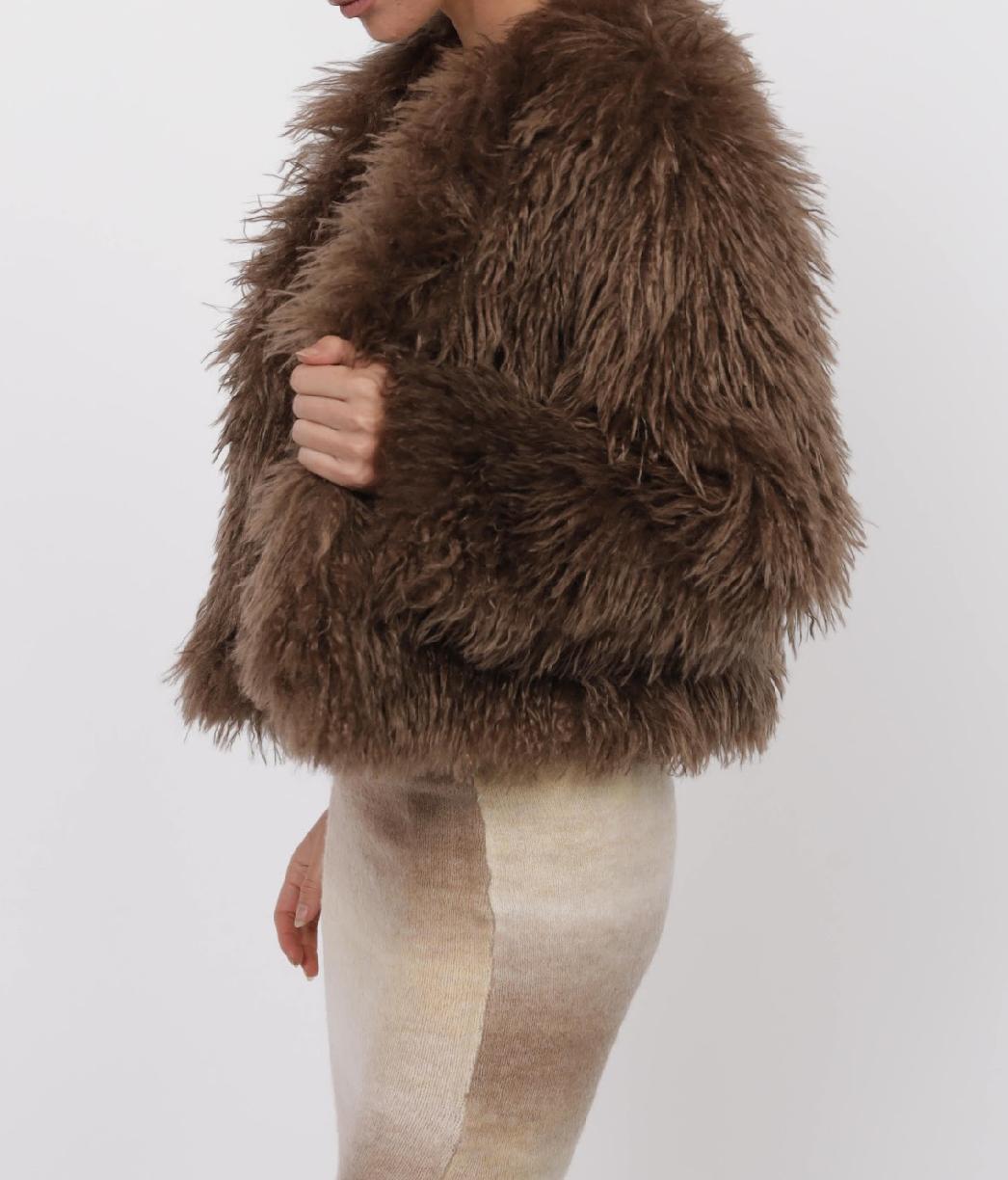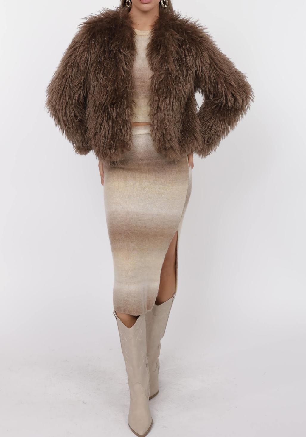 Wrap yourself in cozy luxury with this statement-making faux fur jacket. Designed in a rich deep brown shade, it features a plush, shaggy texture that adds instant glam and warmth to any look. The cropped length and relaxed silhouette make it easy to layer over dresses or denim, while the voluminous sleeves bring a chic, elevated touch. Perfect for a night out or dressing up your everyday style, this jacket will keep you warm while turning heads. Shown here with our Palmer Ombré Sweater Tank and Skirt.