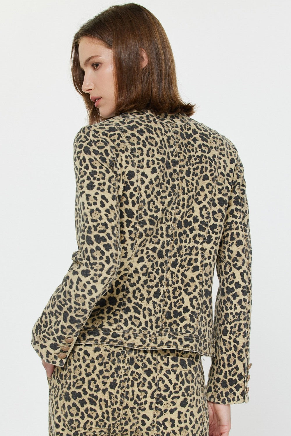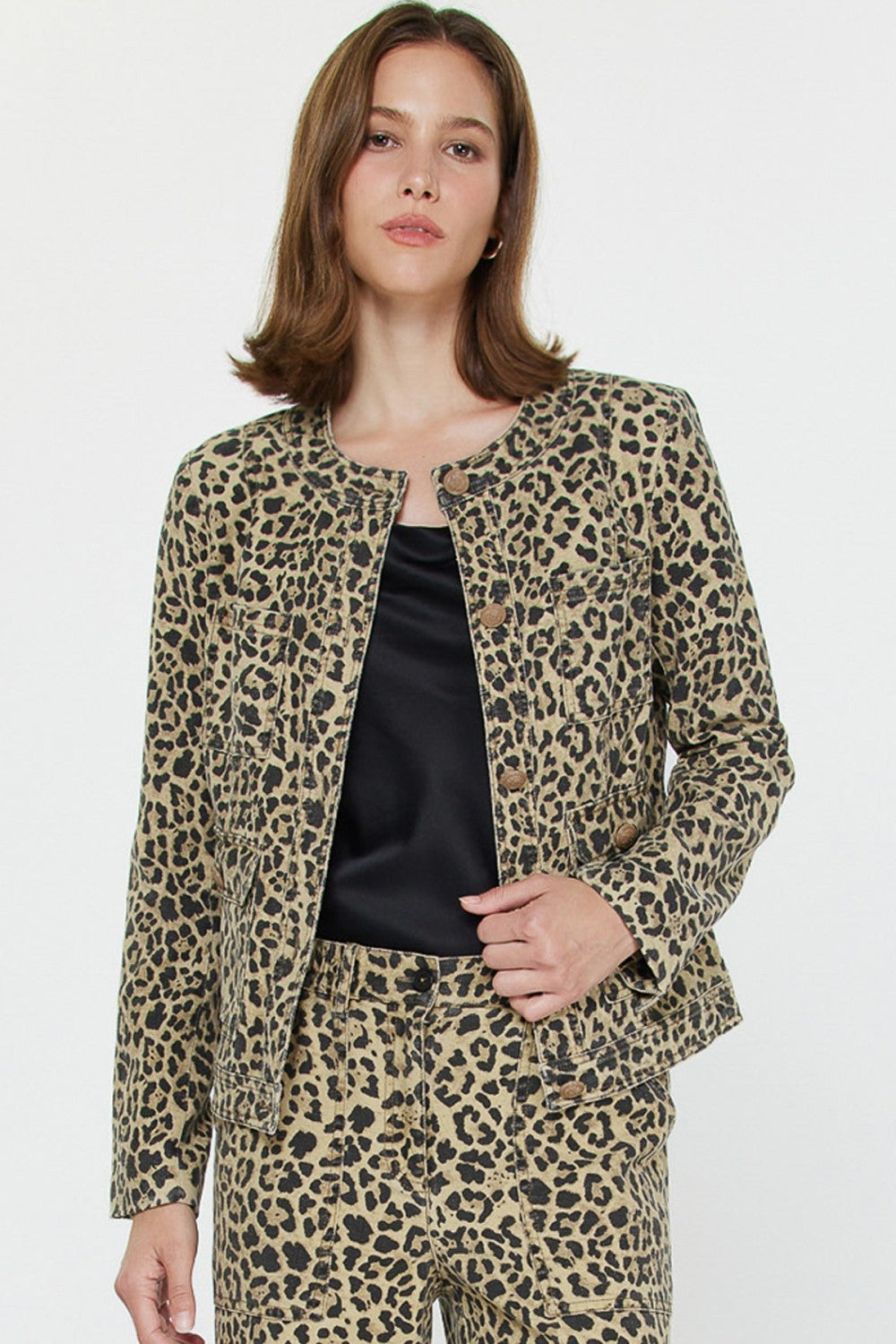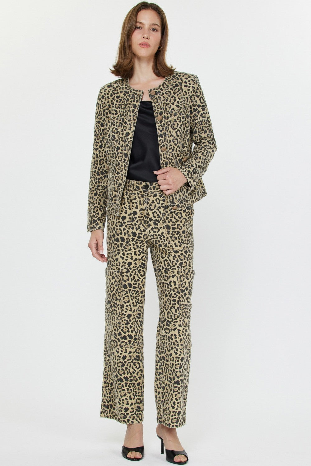 A chic update on a timeless silhouette, this leopard print jacket adds instant edge to any look. Designed with a collarless neckline, button front closure, and multiple utility-style flap pockets, it strikes the perfect balance between structured tailoring and playful attitude. The fitted cut creates a flattering shape while the all-over animal print makes it an unapologetic statement piece. For a complete set, get the matching Leopard Cargo Pant.