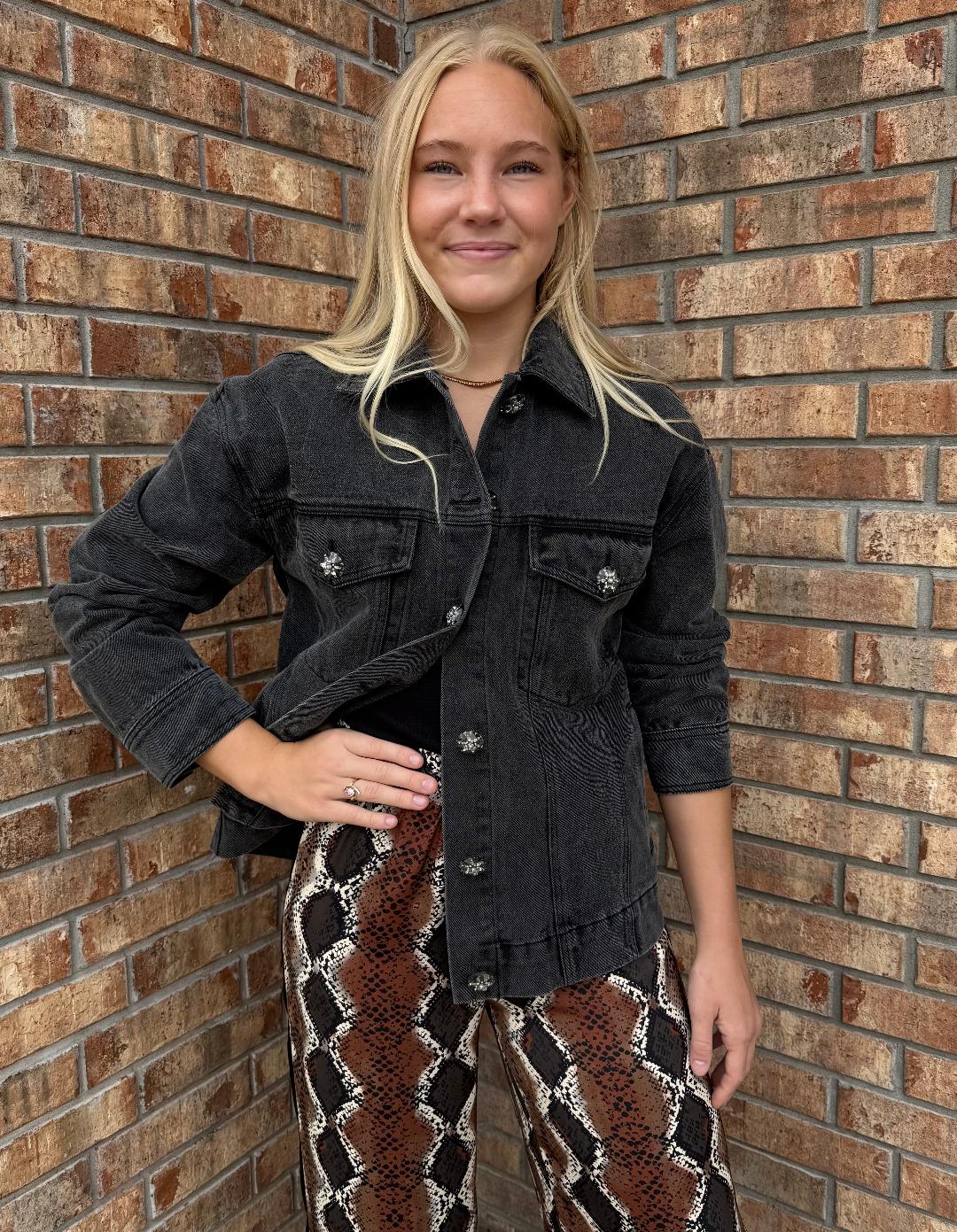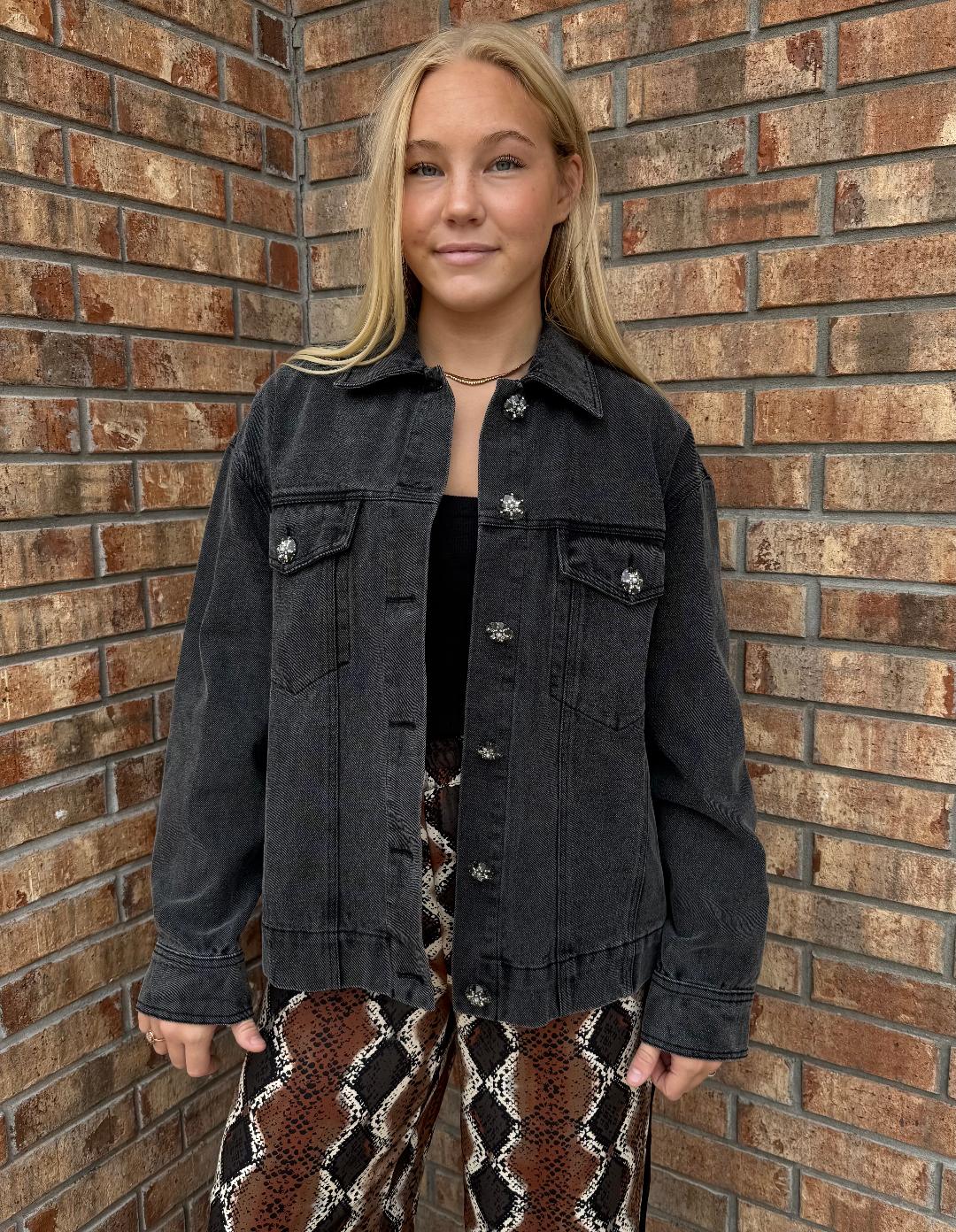 This is not your average denim jacket. The Starstruck in Charcoal Denim Jacket takes a classic silhouette and adds a glam twist with its eye-catching crystal and pearl flower buttons. Crafted in a soft charcoal wash, it strikes the perfect balance between edgy and feminine. Layer it over everything from satin tanks to cozy turtlenecks for a versatile fall look that sparkles in all the right ways.
