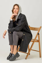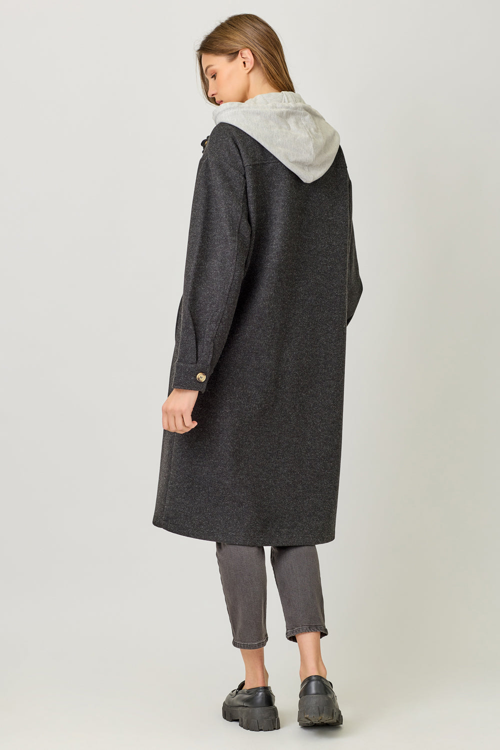 This charcoal coat with a built-in hoodie is the ultimate blend of polish and casual ease. Designed with a longline silhouette and classic button-front closure, it features utility-style flap pockets at the chest and side slit pockets for added function. The soft grey hood is seamlessly attached, giving it that layered two-in-one look without the bulk—perfect for days when you want the vibe of a hoodie layered under a coat. The versatile mid-weight fabric makes it ideal for transitional weather, while the relaxed cut allows for easy styling over denim, knits, or even dresses. A modern piece that balances structure with laid-back streetwear edge.