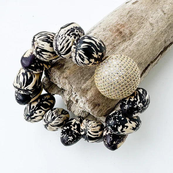 Natural texture meets high-glam sparkle in the Luxe Amani Bracelet. Featuring bold black-and-ivory patterned seed beads and a statement pavé crystal globe, this piece brings earthy elegance with a luxe twist. Get the matching necklace HERE!