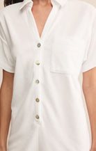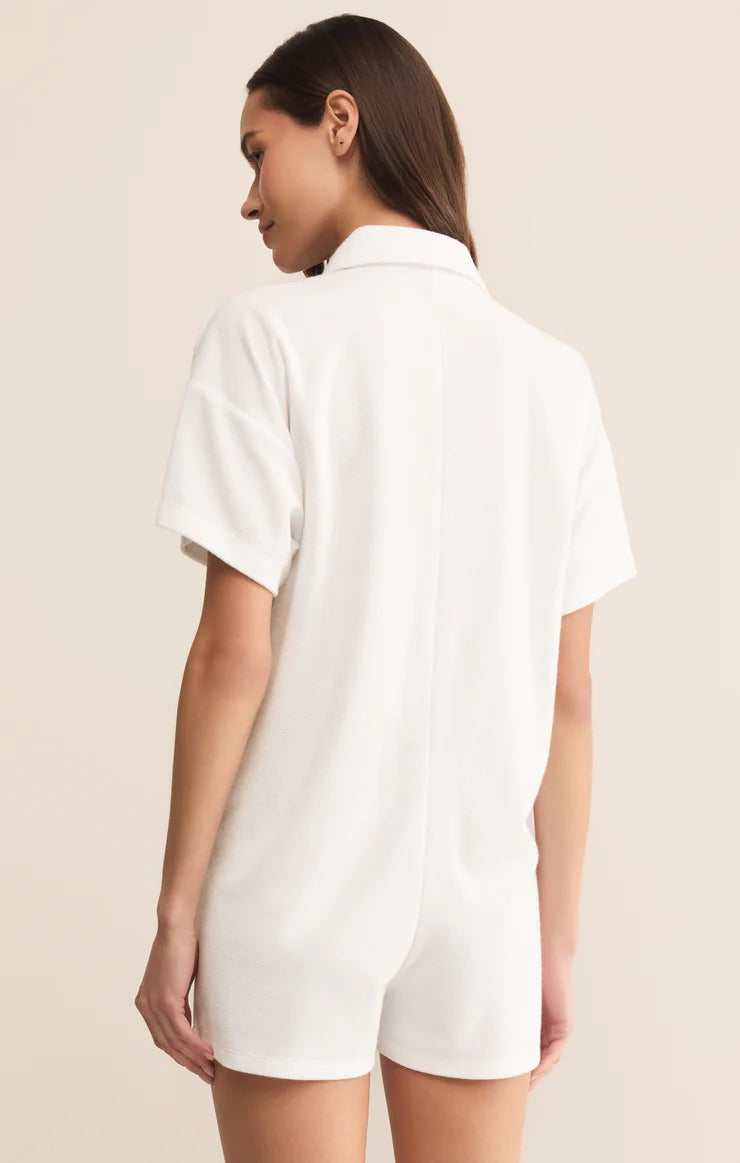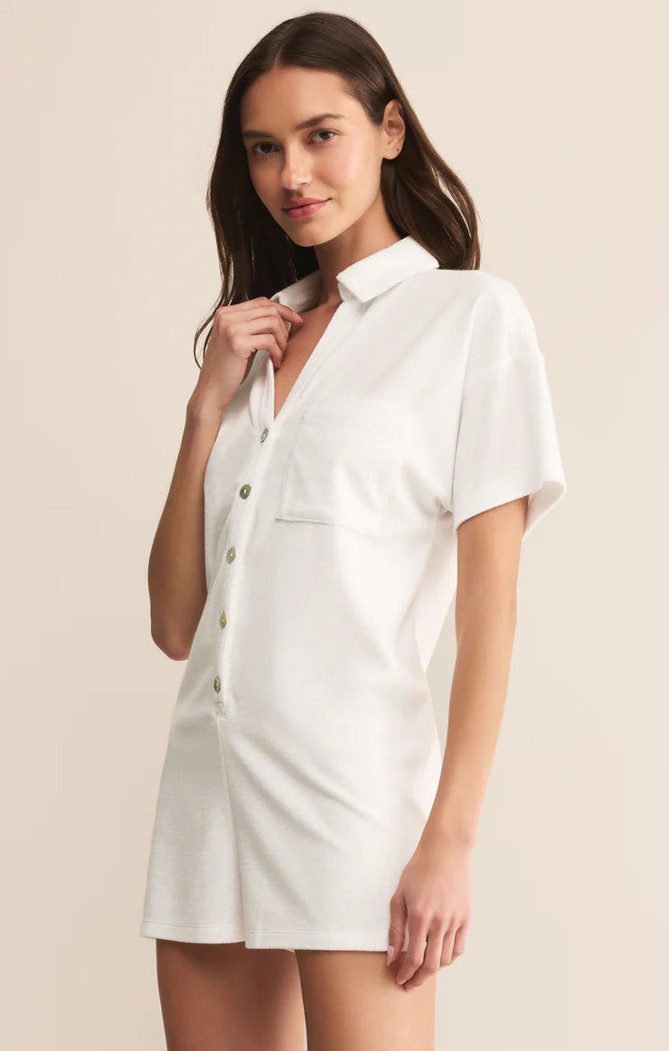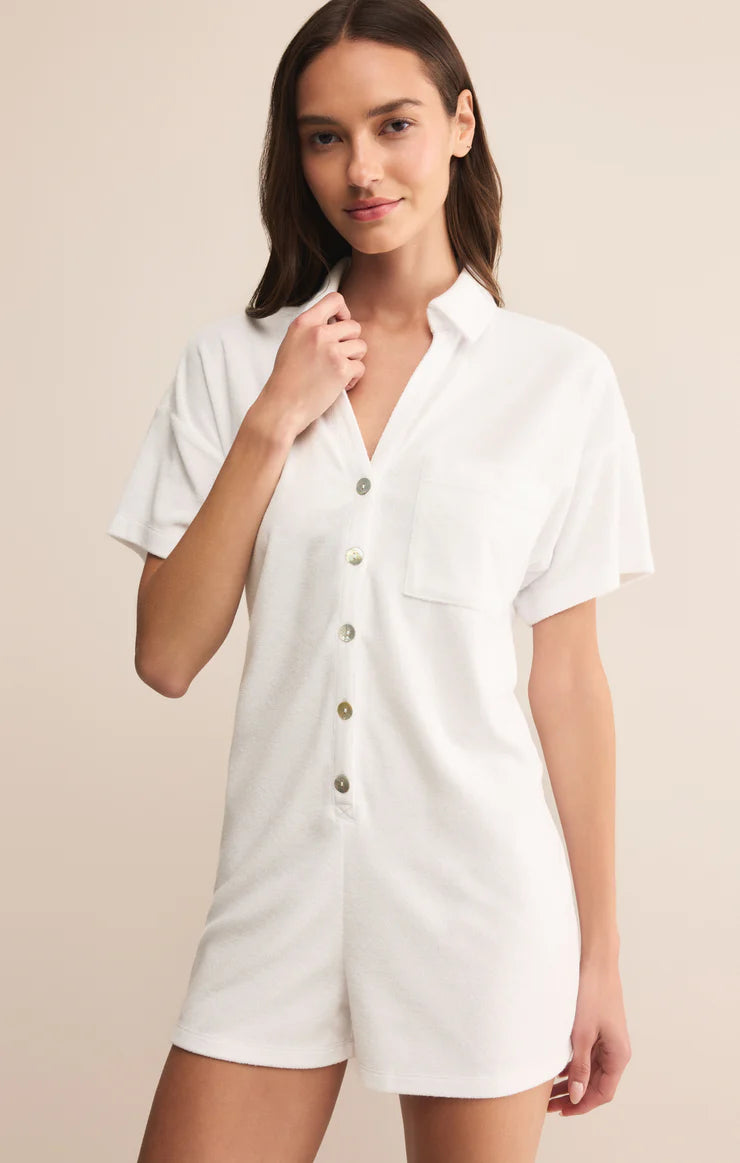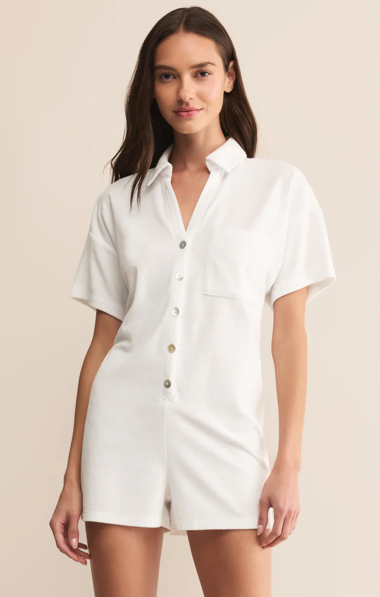 This short sleeve romper is crafted from cozy Loop Terry fabric with a relaxed fit and button-up front for easy wear. The collared design and chest pocket keep it laid-back but polished, whether you're curled up or catching up.