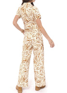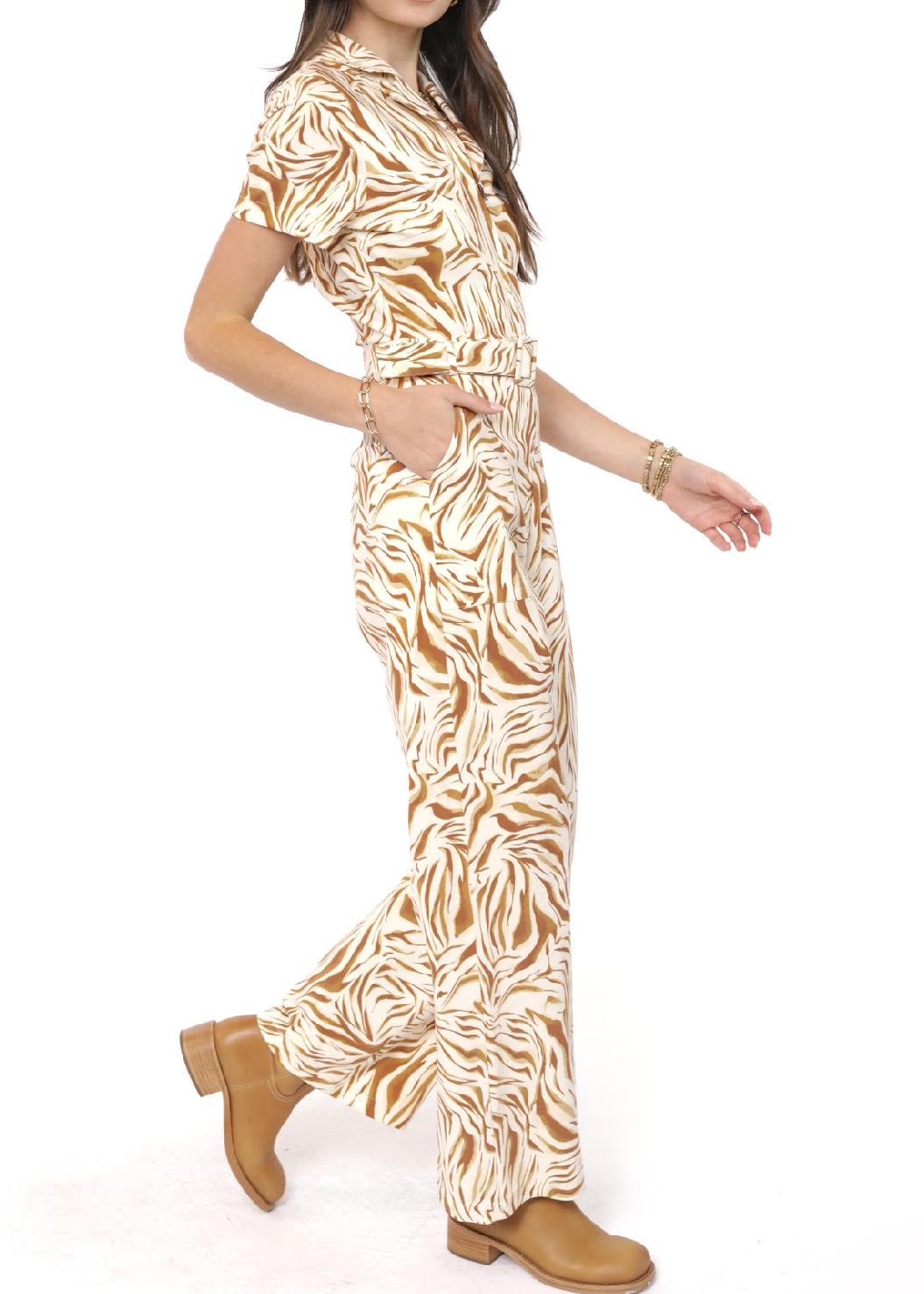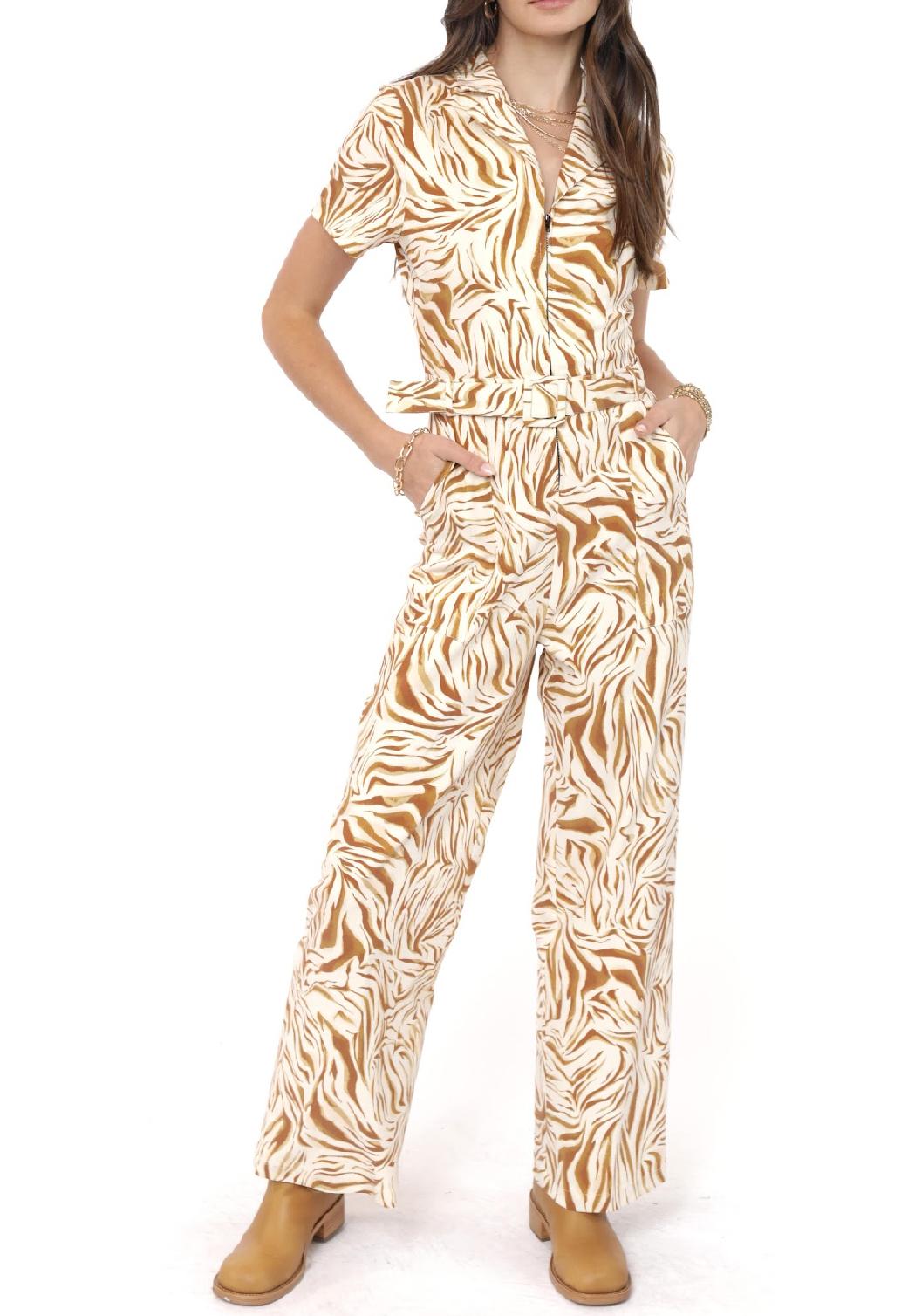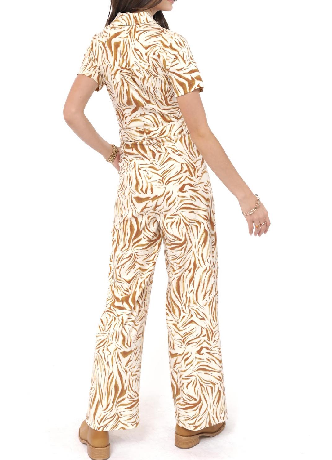 Turn heads in this striking zebra print jumpsuit, crafted in a warm camel and ivory palette that feels both playful and chic. Designed with a collared neckline, short sleeves, and a functional zip-front closure, this piece blends utility-inspired details with effortless style. The self-tie belt cinches the waist for a flattering fit, while the wide-leg silhouette adds flow and comfort. Side pockets complete the look with everyday ease. Perfect for a standout day-to-night outfit—pair with ankle boots for a laid-back vibe or elevate with heels and statement jewelry for a city-ready finish.