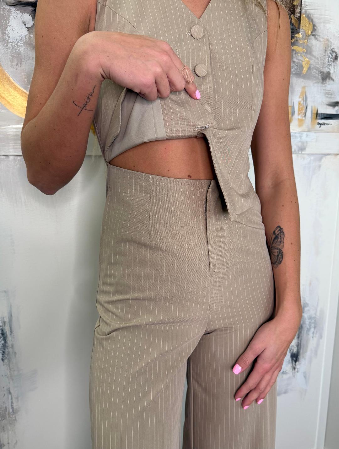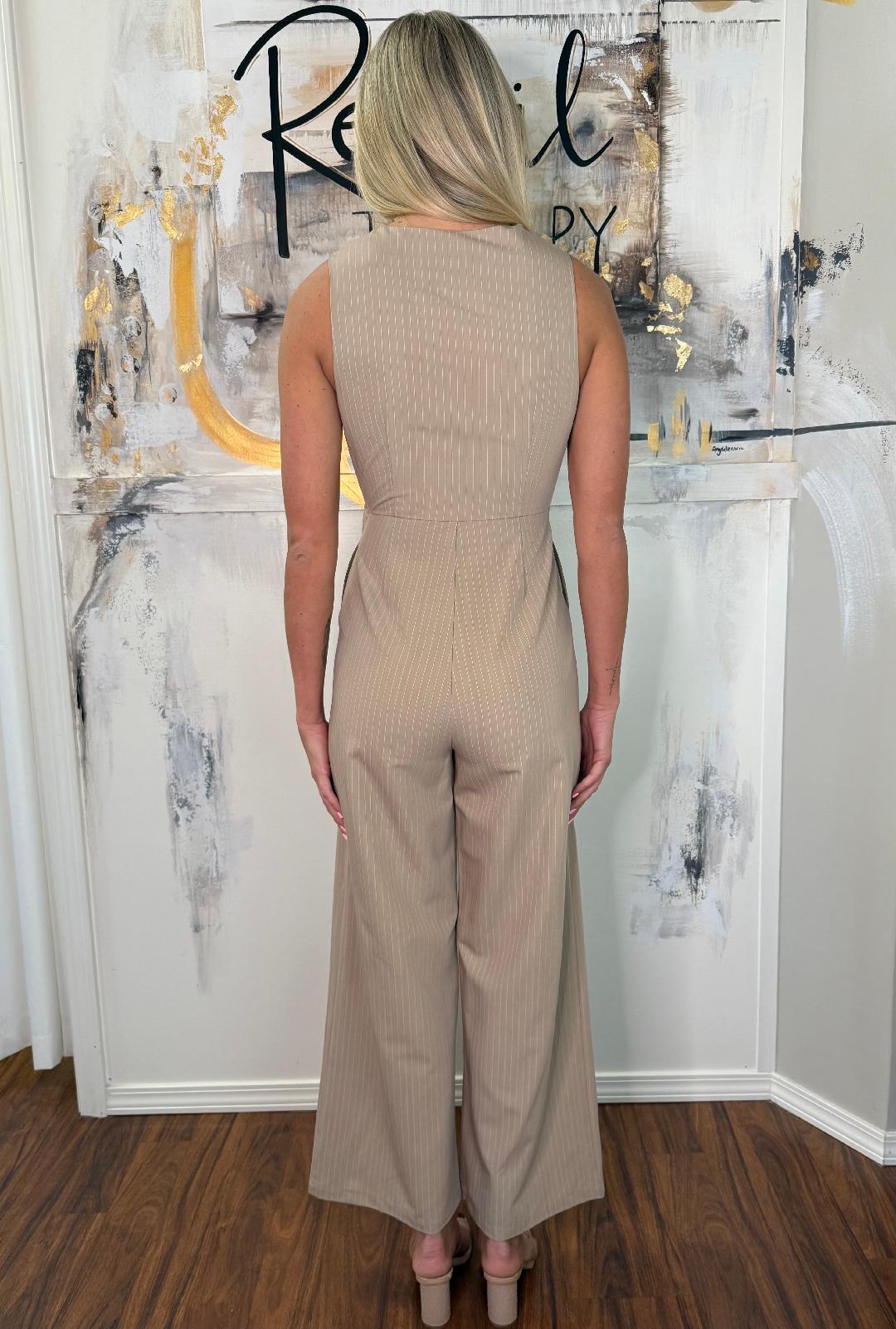 Unique and sure to turn heads! This jumpsuit gives the look of a vest and trouser, attached at the sides and back. Slip on your heels and feel powerful when you wear this jumpsuit!