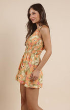 Bring the sunshine with you wherever you go in the Sunset Aperitivo Romper. Bursting with tropical florals in vibrant shades of coral, peach, and green, this lightweight romper is made for carefree summer days and golden hour happy hours. It features a flattering scoop neckline, ruched bodice, and a stretchy smocked waist that cinches just right. The soft fabric flows into a flirty, skirt-like short for added movement and charm.