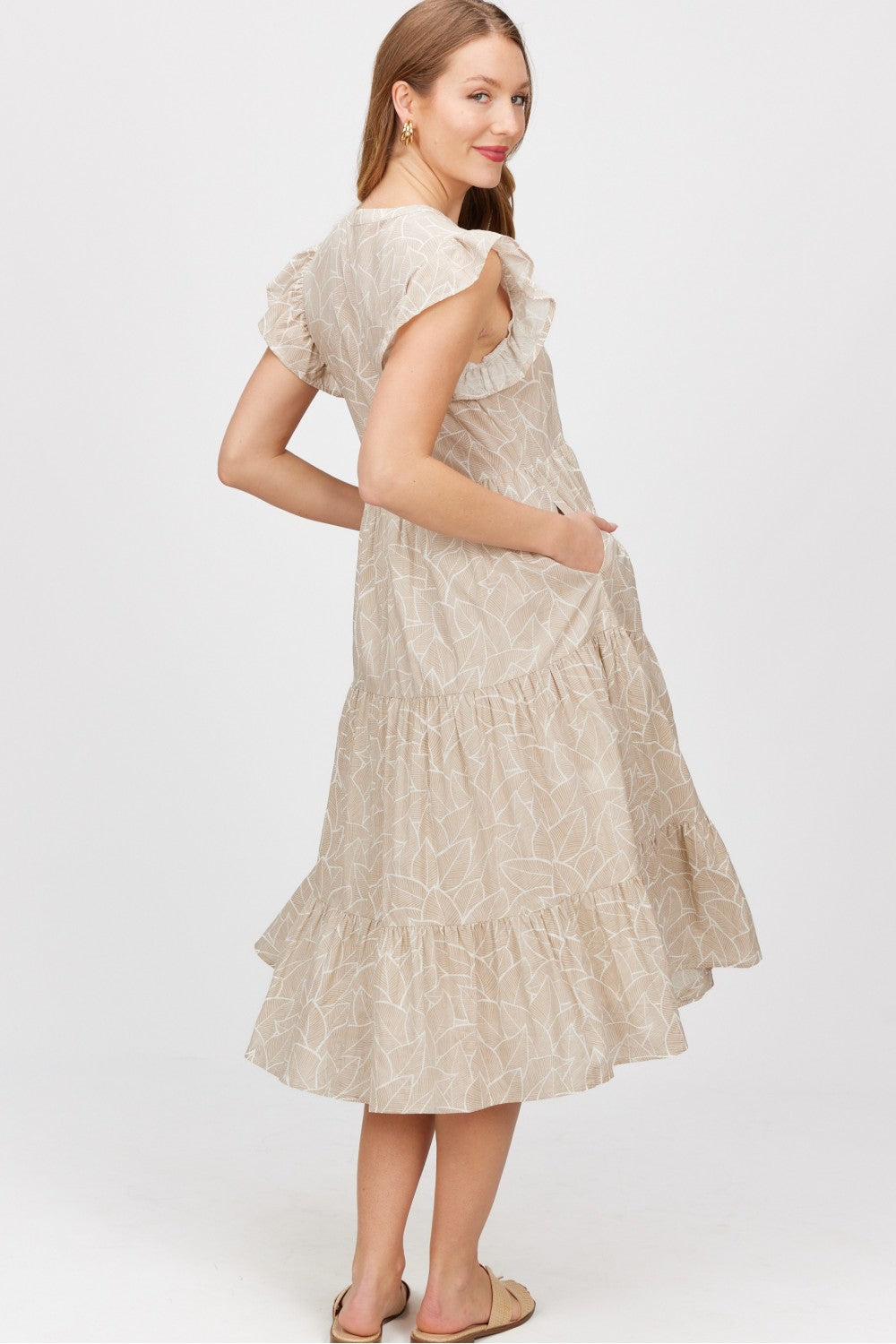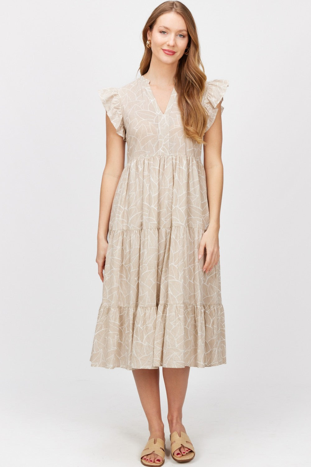 Crafted from breathable lightweight cotton, this dress features delicate ruffled sleeves that add a touch of romance. The tiered midi silhouette creates graceful movement, making it perfect for both casual days and special occasions.