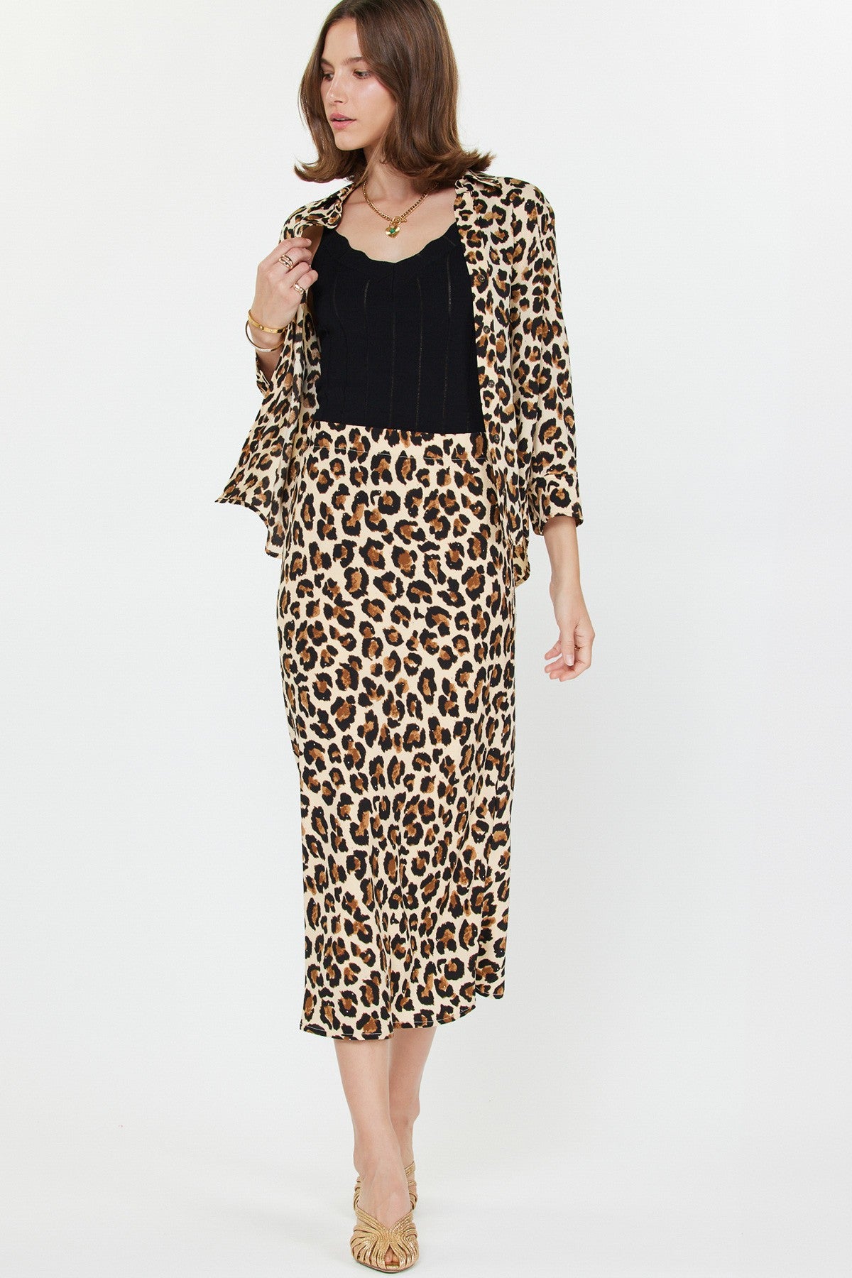 The skirt is a high-waisted, bias-cut midi with the same striking leopard print as the blouse, creating a coordinated look when worn together. Falling to mid-calf, it has a subtle flare at the hem for ease and fluid movement. The silky drape of the fabric gives it an elegant finish, while the animal print adds a statement-making edge. Topped off with silver embellishments that add a little sparkle.
