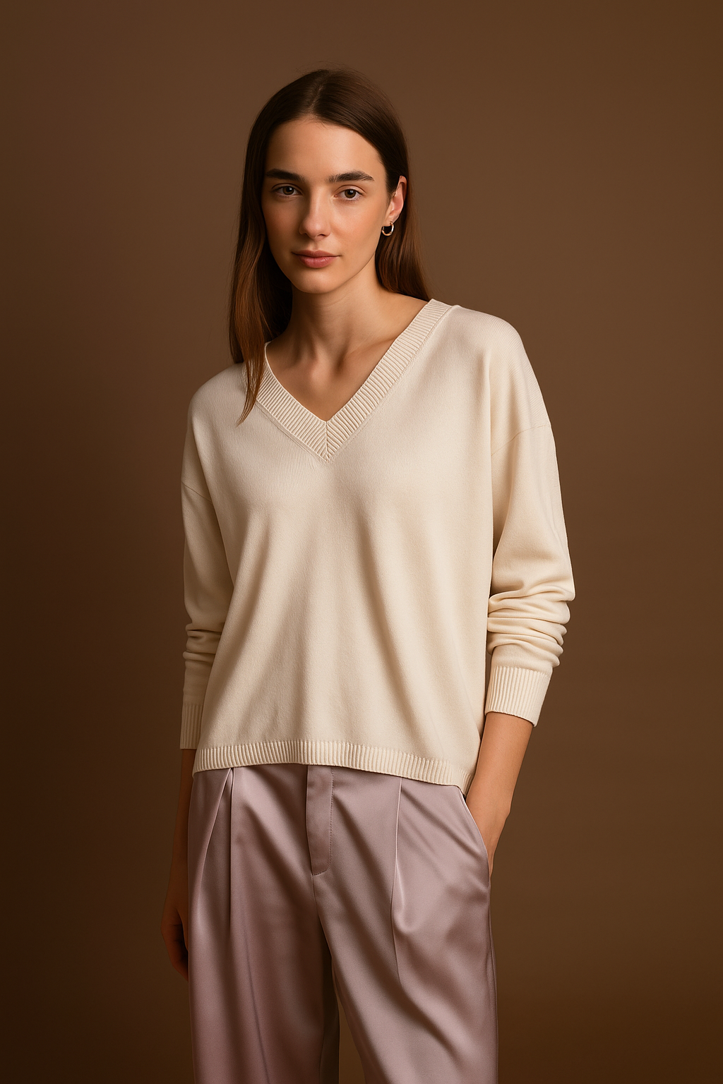 A relaxed-fit V-neck pullover with a minimalist, timeless design. It features a deep ribbed V-neckline, long sleeves with ribbed cuffs, and a ribbed hem that slightly dips in the back for a subtle high-low effect. The knit is smooth and lightweight, giving it a soft drape that pairs easily with both casual and tailored pieces. The ecru color offers a versatile, neutral tone that works beautifully for layering or wearing on its own, making it a staple sweater for any season.