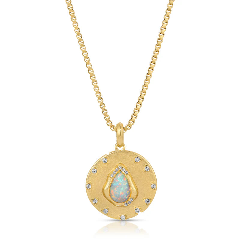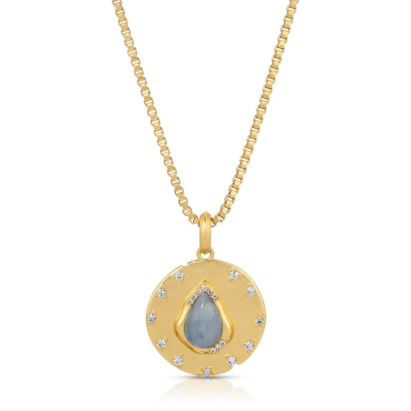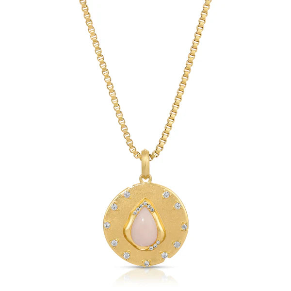 We love a good medallion necklace! The Luster medallion features a teardrop gemstone (opal, kyanite or pink opal) center that is surrounded by a unique round border with cz accents.