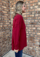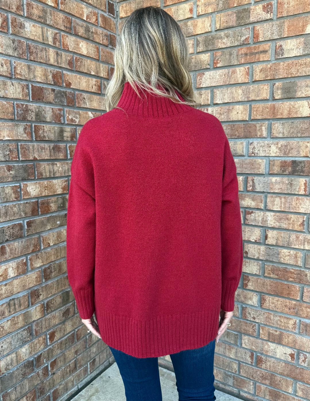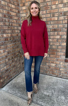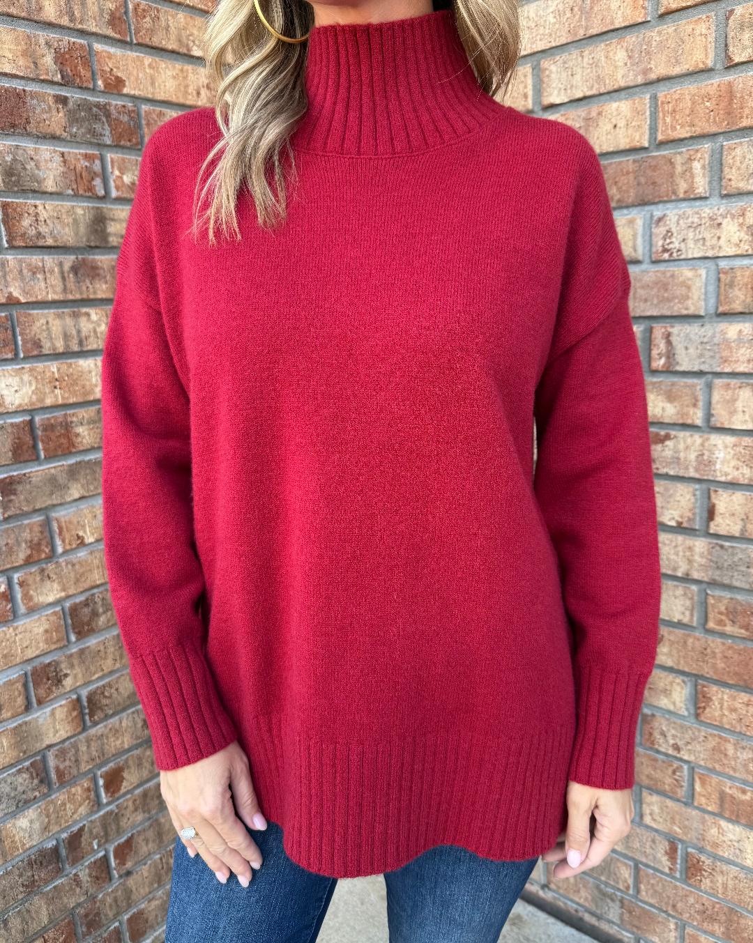 This rich burgundy sweater is a timeless cold-weather essential with a relaxed, oversized fit. Crafted in a soft knit, it features a ribbed mock neck, cuffs, and hem for a cozy yet polished finish. The length is slightly longer, making it a perfect choice to pair with leggings for easy, all-day wear. Whether styled casually with denim or dressed up with sleek bottoms, this sweater brings warmth and effortless sophistication to your wardrobe.