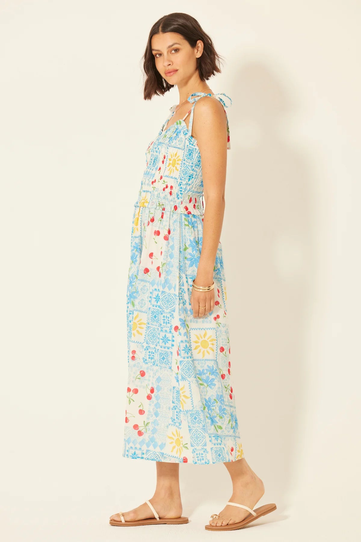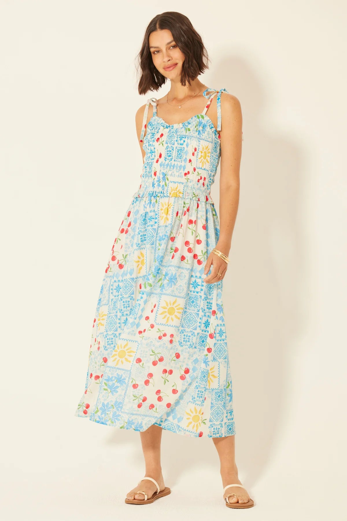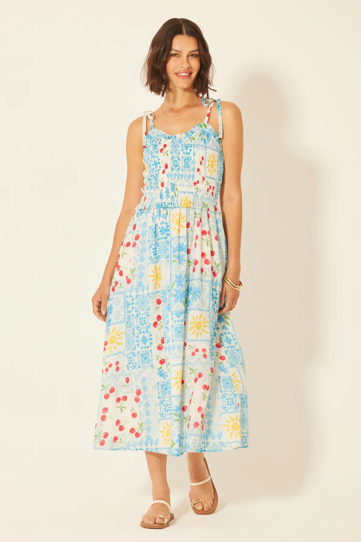 Add a splash of color to your summer with the Sunshine Cherry Maxi. This cheerful patchwork print is a cocktail of cherries, flowers, sunshine, and Mediterranean-inspired blue tile motifs. Designed with sweet tie straps, a smocked bodice, and playful back cutouts, it’s breezy, flattering, and full of personality. Perfect for sunny strolls, vacations, and backyard brunches—this dress is your all-in-one mood booster.