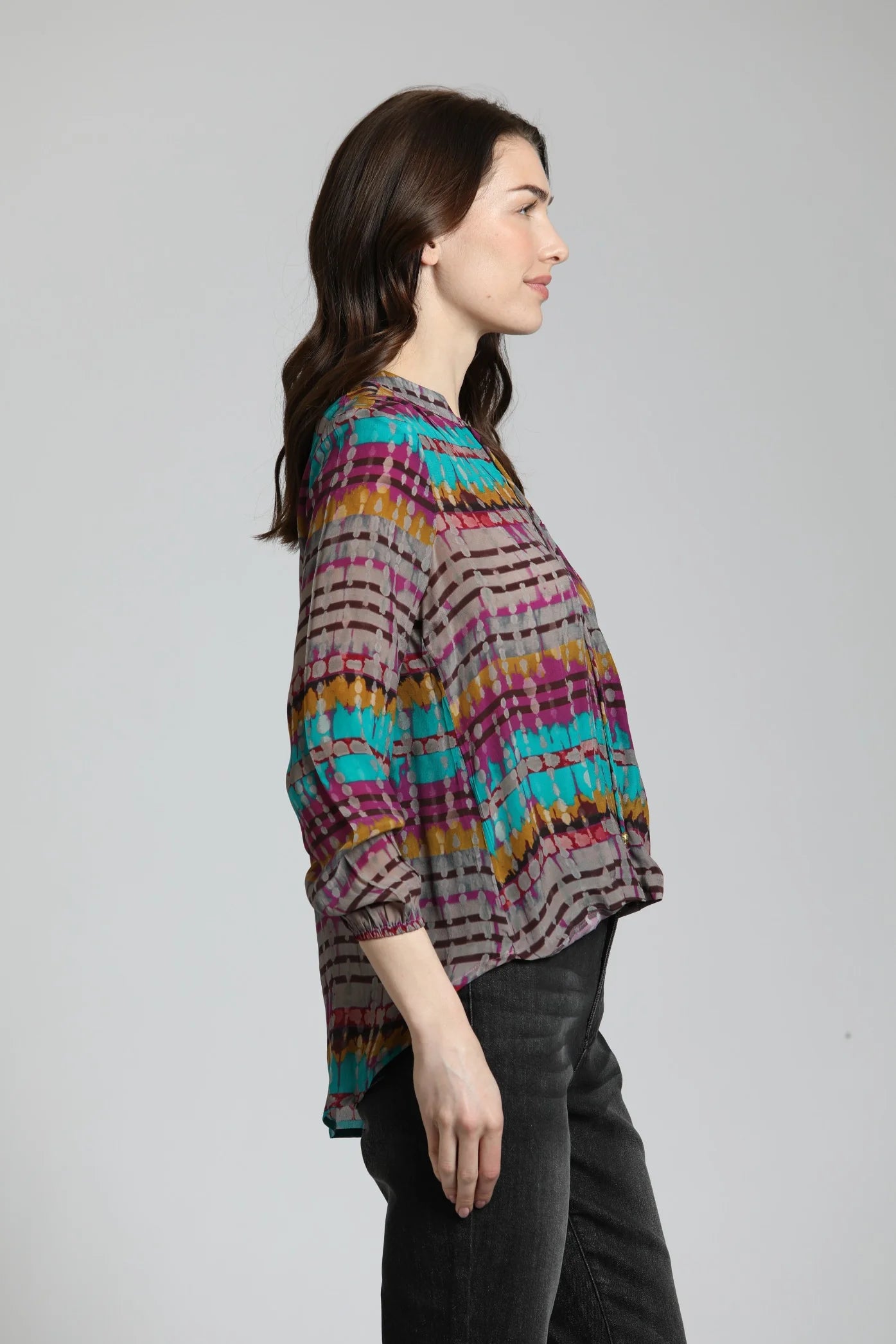 A gorgeous color palette and unique print made in a luxurious viscose/cupro sustainable fabric. Shades of chocolate brown, mustard, magenta, teal and red make this top versatile to style with trousers for work or denim. Breathable and comfortable on the skin.