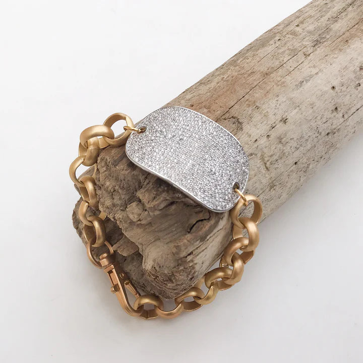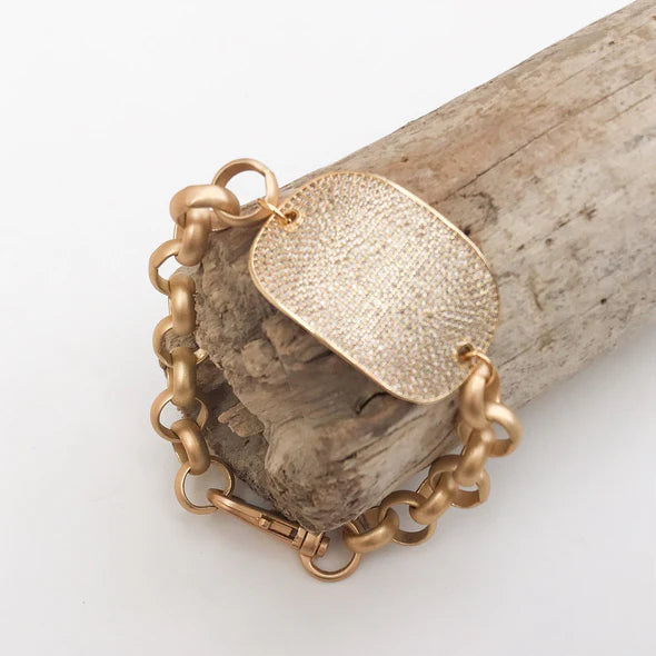The Pavé Tag Bracelet blends bold gold links with a soft rectangular pavé CZ centerpiece—effortlessly luxe and endlessly wearable. A standout piece for stacking or solo styling.