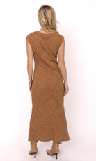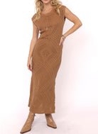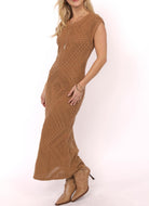 Boho charm meets timeless elegance in this stunning crochet-inspired knit dress. Designed in a warm camel hue, the fitted silhouette features cap sleeves, a crew neckline, and a full-length hem for an effortlessly elongating look. The intricate diamond and textured knit patterns create beautiful dimension, while the soft open-weave keeps it breathable and perfect for transitional seasons. Pair with boots for a laid-back western vibe or dress it up with strappy heels for a chic night out.