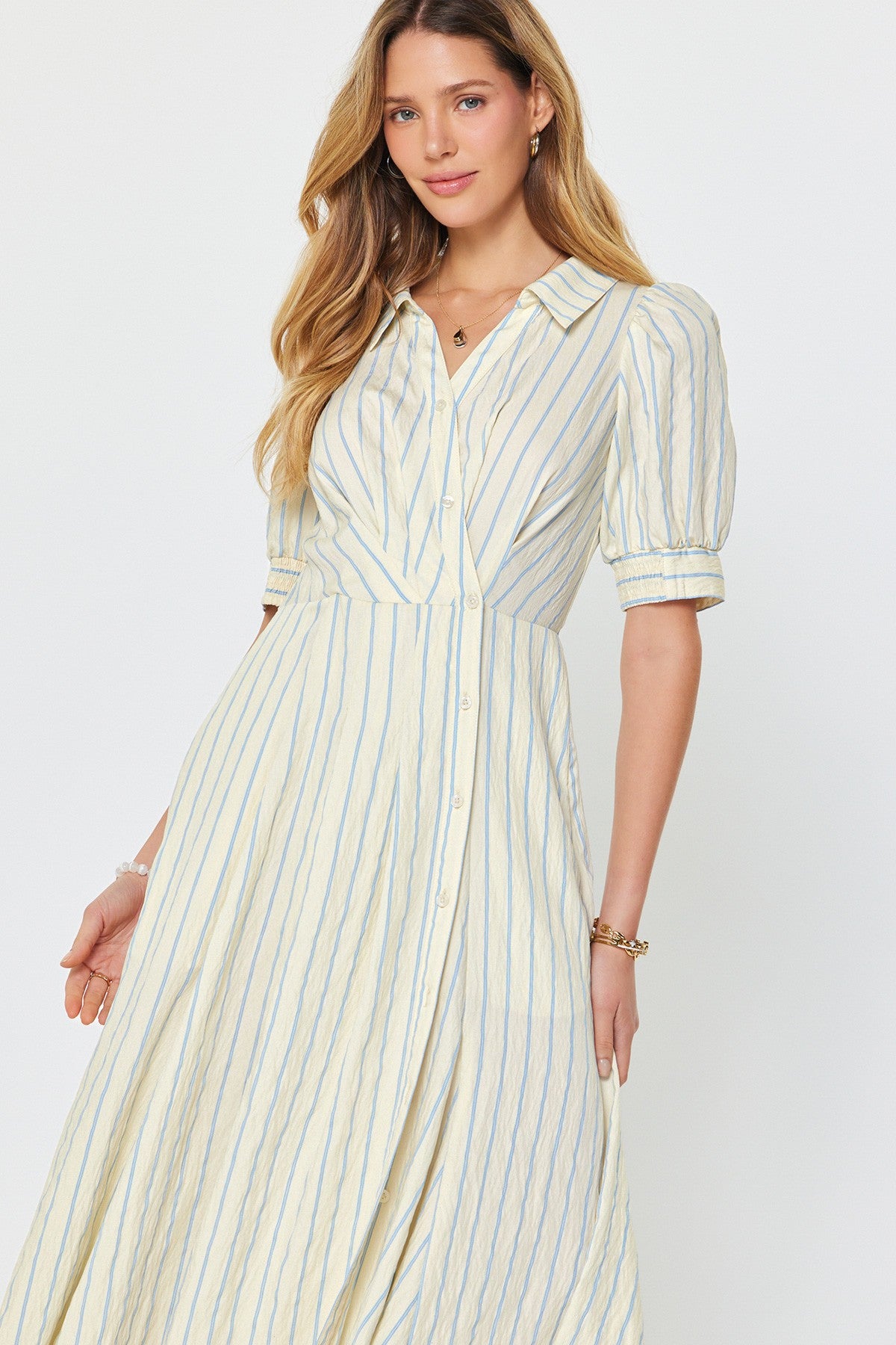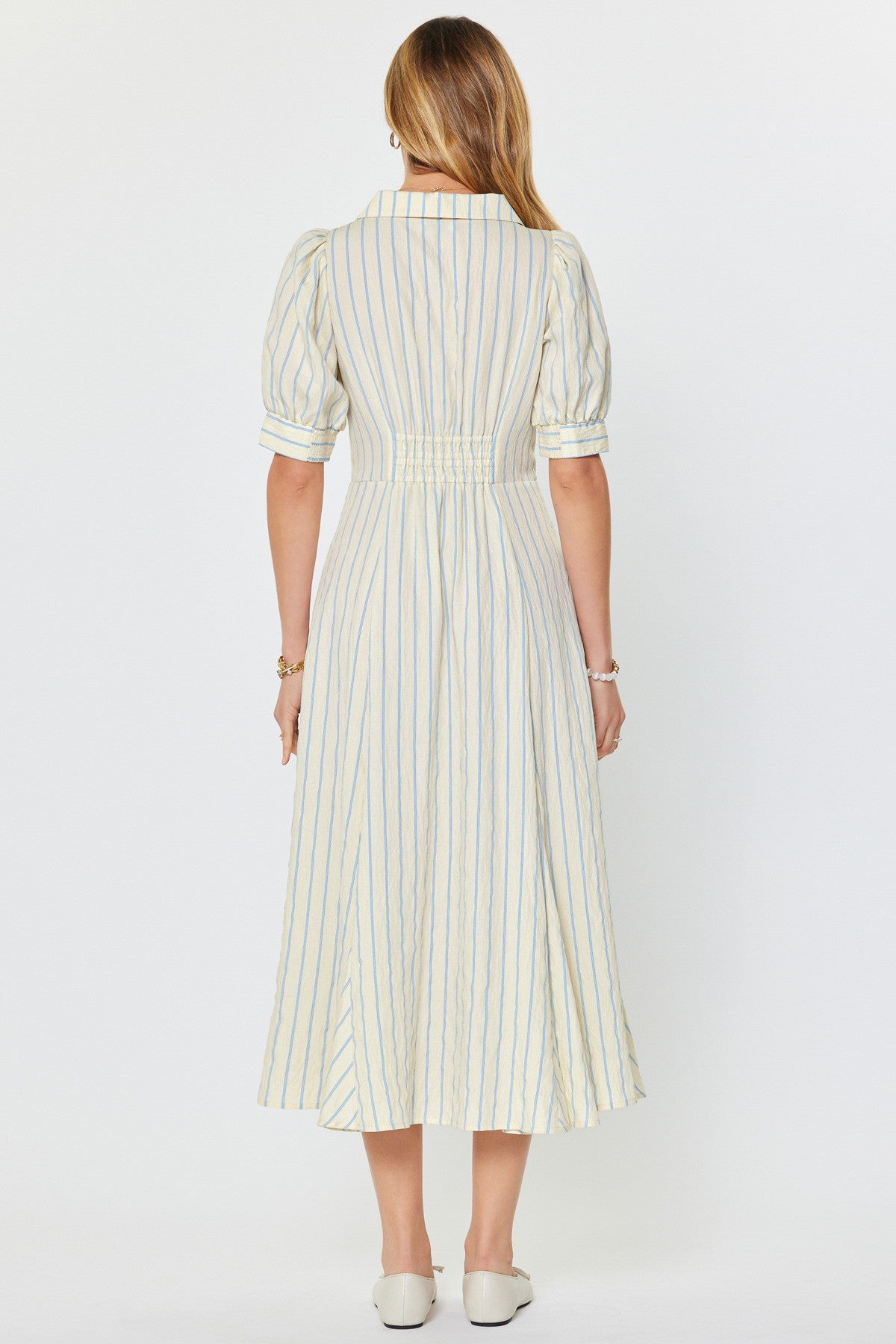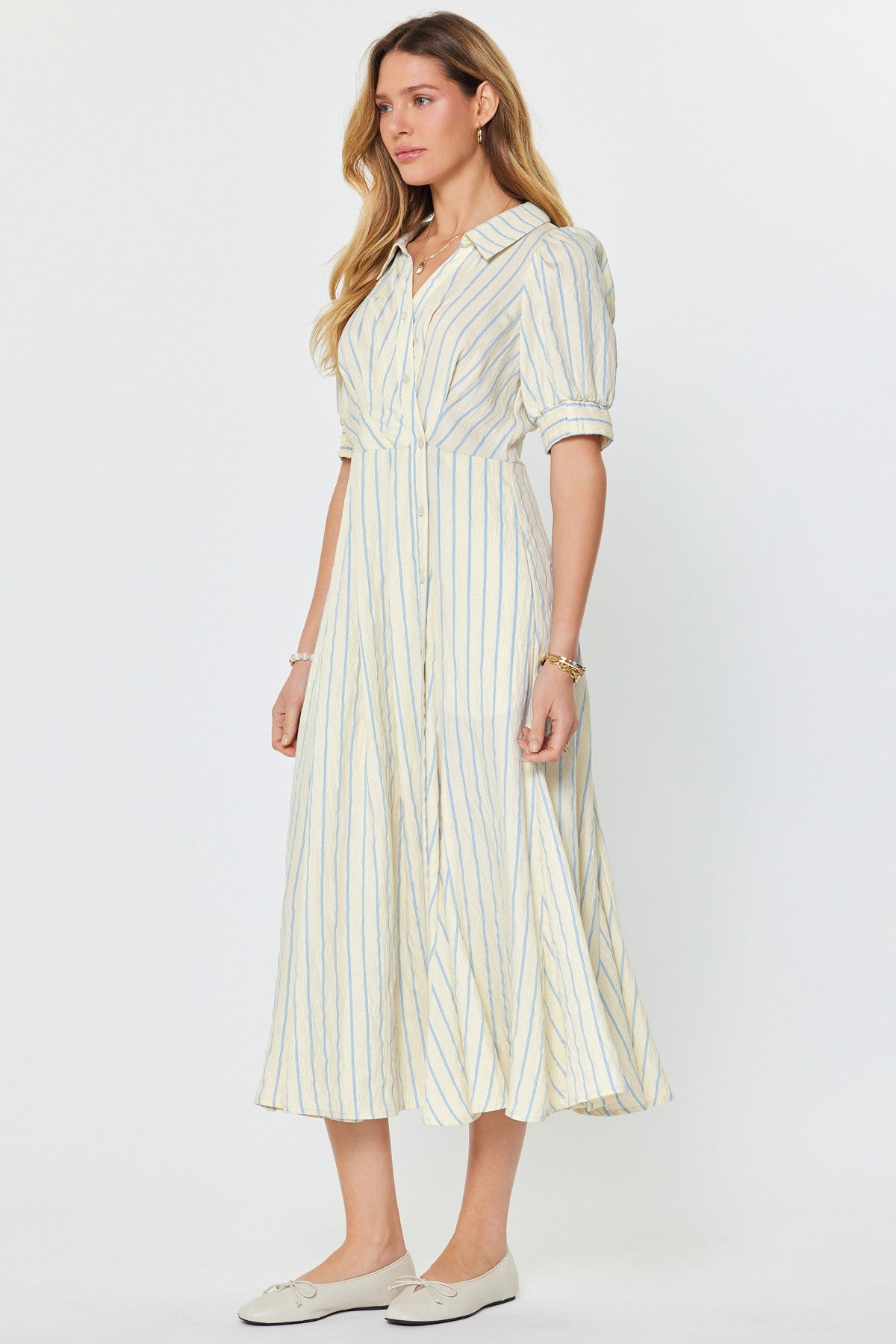 A timeless, feminine silhouette with a fresh, tailored feel—this striped maxi dress is designed to flatter from every angle. The allover vertical stripe elongates the figure, while the asymmetric button-down front adds a modern, eye-catching detail. A classic shirt collar and softly structured bodice give it a polished touch, balanced by short puff sleeves with smocked cuffs for a hint of romance. The smocked back waist ensures a comfortable, flattering fit, flowing into a beautifully draped godet flared skirt that moves effortlessly with you. Finished with side pockets (because yes, it has them), this is the kind of piece you’ll reach for all season long.