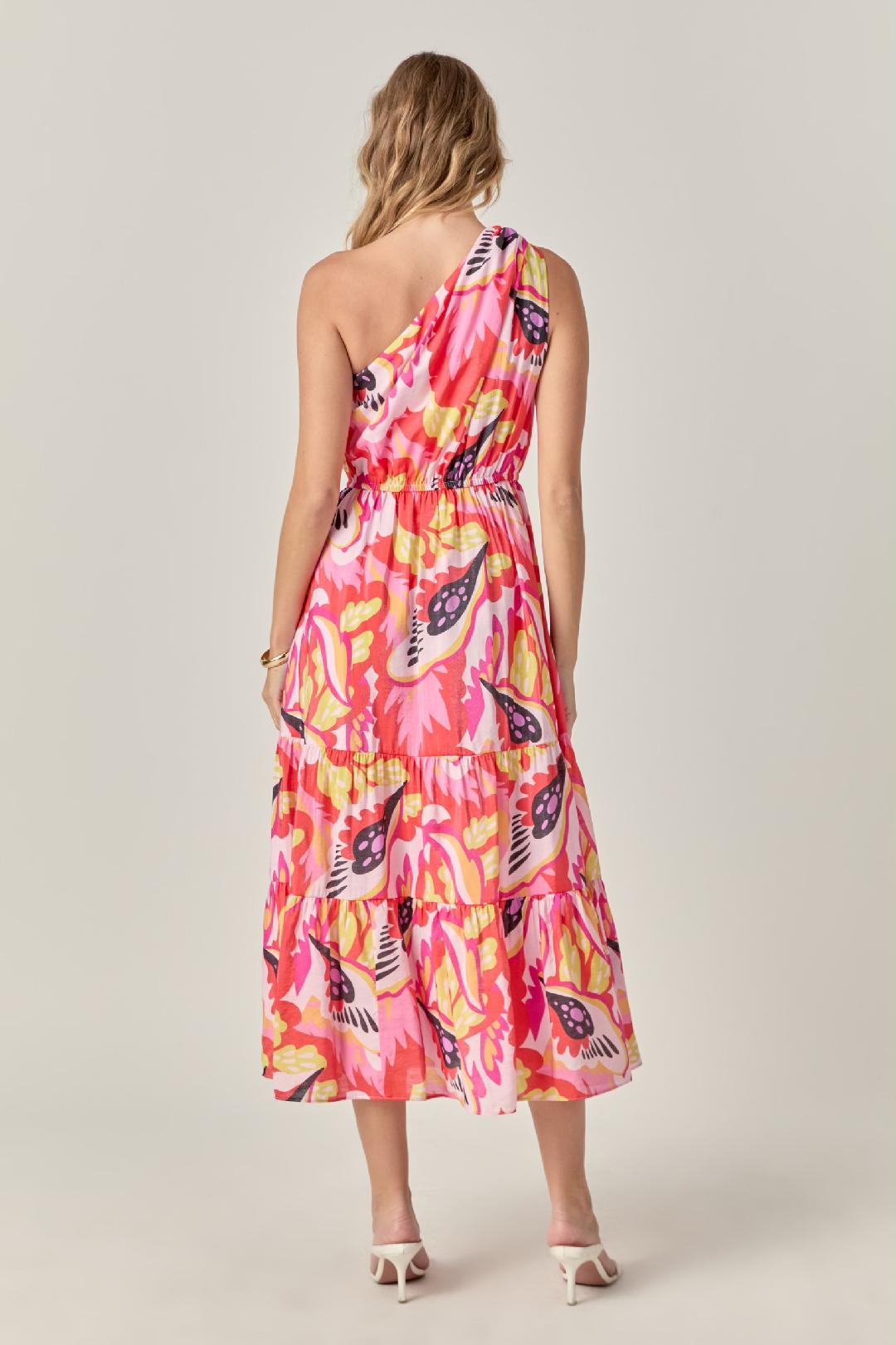 Make a statement without saying a word in the Tropic Twist One-Shoulder Maxi Dress. Bursting with vibrant pink, coral, yellow, and bold abstract floral prints, this dress is made for sunny escapes and stylish celebrations. The asymmetrical one-shoulder neckline adds a touch of modern elegance, while the tiered skirt brings playful movement and flow. Lightweight and effortlessly flattering with an elastic waistline, this dress is perfect for vacation dinners, summer weddings, or just channeling your inner tropical goddess.