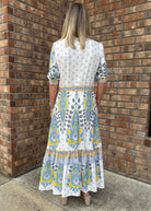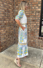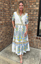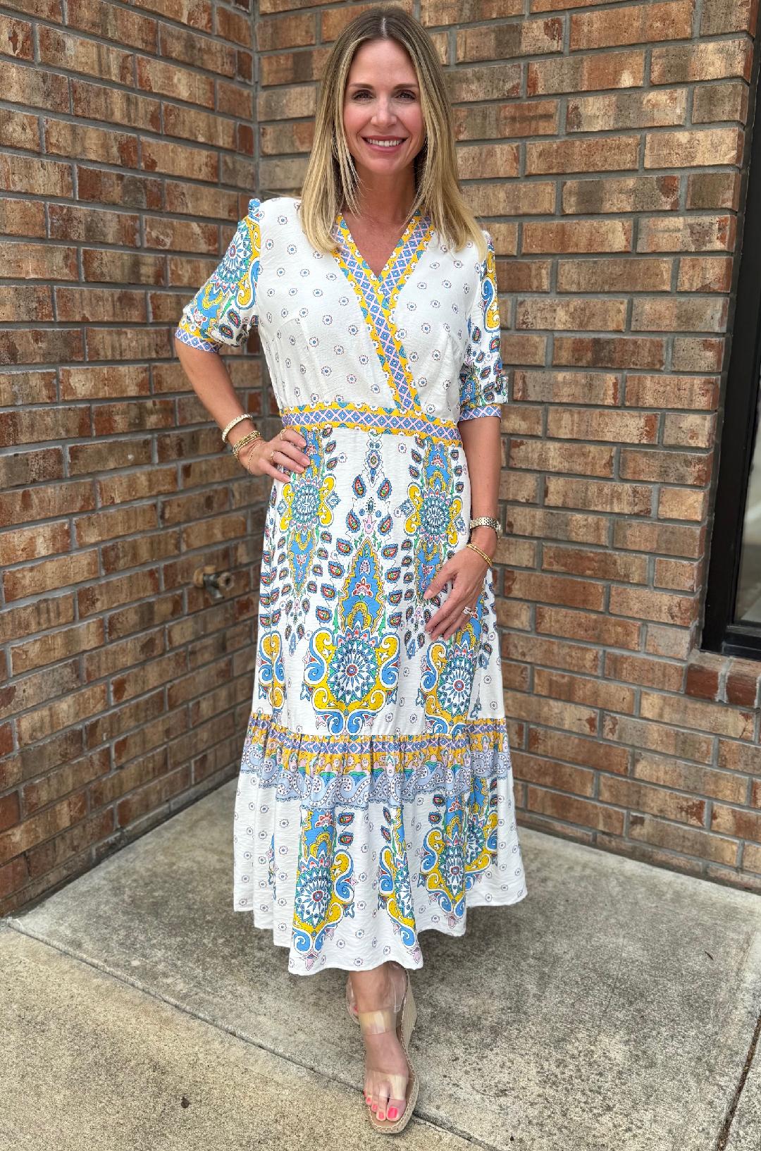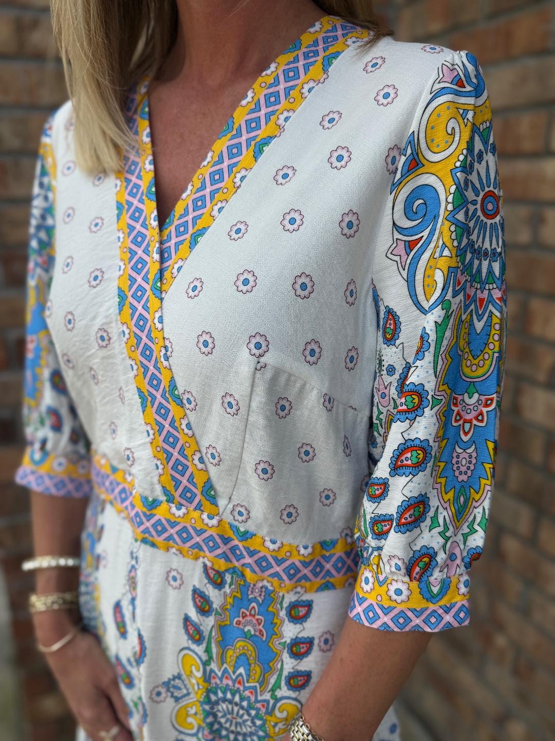 Boho Chic is a clothing collection that is known for their wonderful fabrics, stand-out prints and timeless silhouettes. This effortlessly feminine midi dress blends soft structure with eye-catching detail. Designed with a flattering surplice neckline, it features a discreet snap closure at the V to keep everything perfectly in place while maintaining that easy wrap-style look. The bodice is framed with contrast trim that highlights the waist, flowing into a breezy, tiered skirt that moves beautifully with every step. Crafted in a lightweight, airy fabric, the intricate mix of delicate florals and ornate medallion prints in soft blues, yellows, and hints of pink gives it that signature boho-chic feel. Finished with elbow-length sleeves and side pockets, it’s equal parts polished and effortless—perfect for everything from daytime events to vacation dinners.