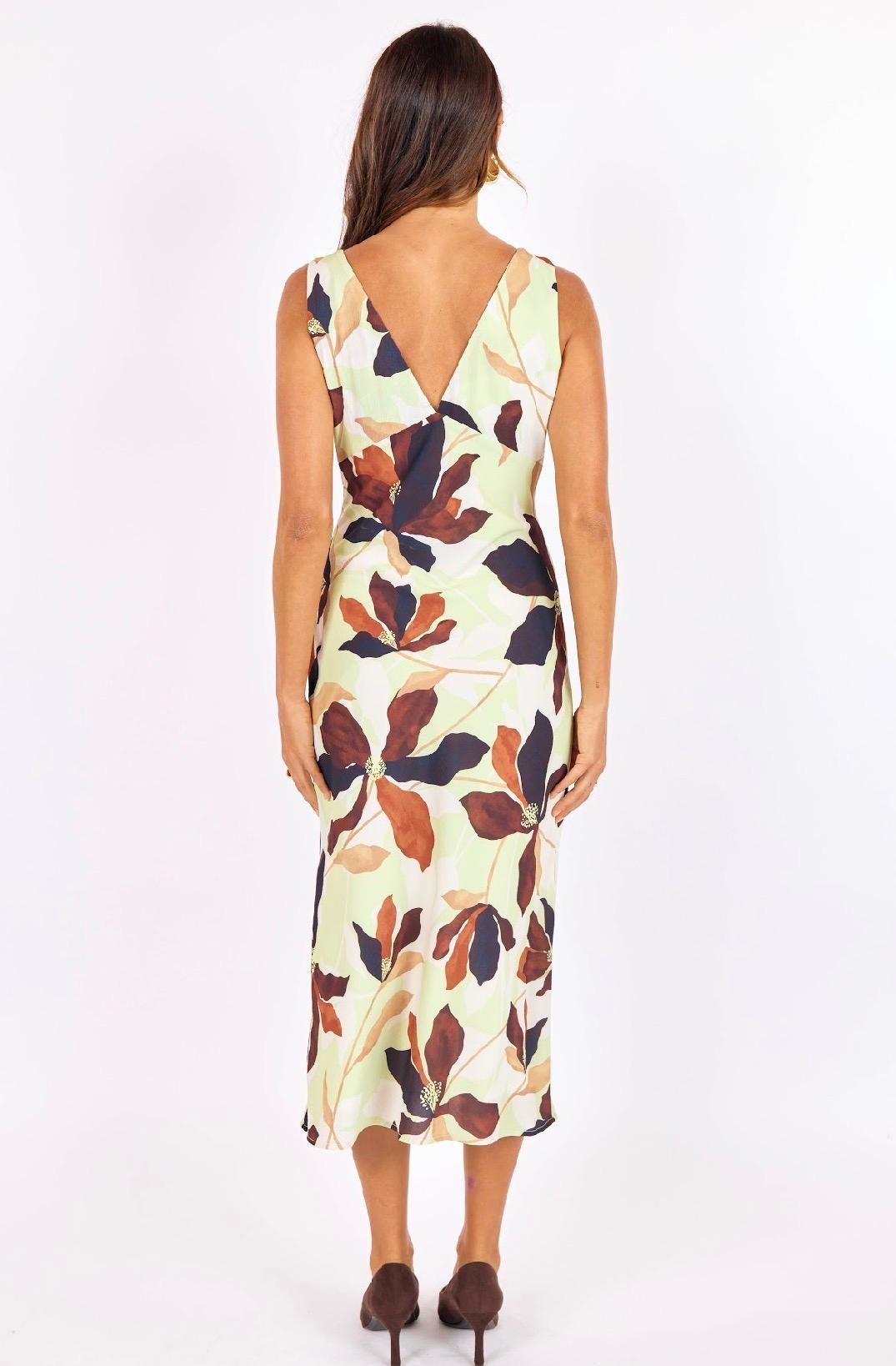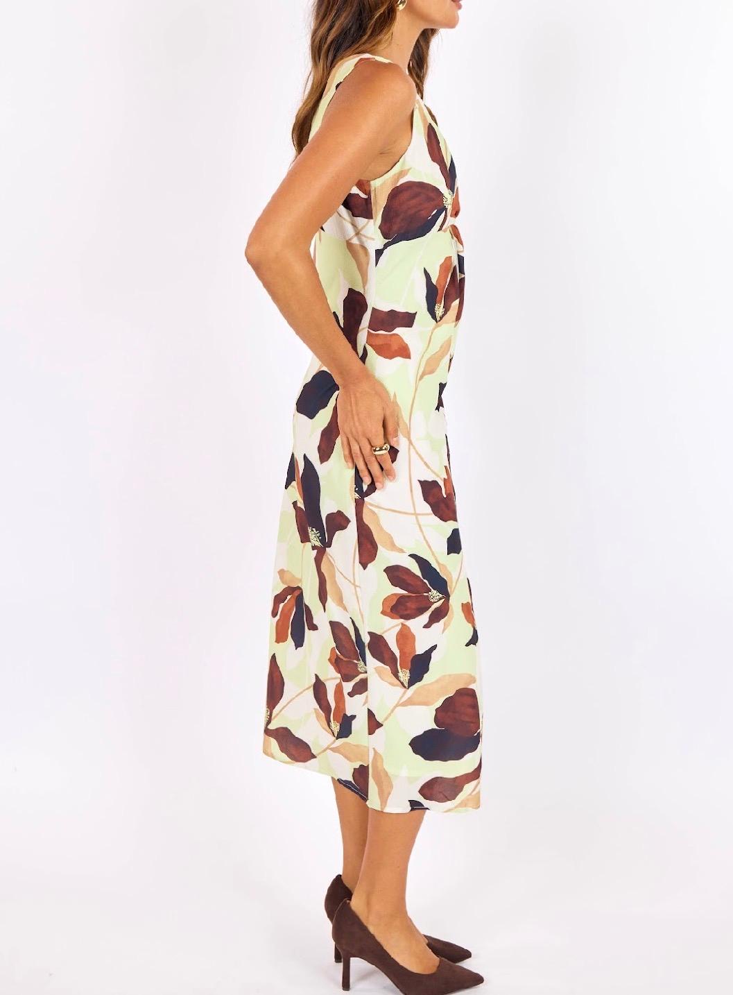This sleeveless midi dress is crafted from a softly textured crepe fabric that drapes beautifully while maintaining a polished silhouette. Designed with a flattering V-neckline that twists at the bust and a gently shaped waist, it skims the body in all the right places. A subtle front slit adds ease of movement and a touch of modern femininity, while the midi length keeps the look refined and versatile. Finished in a bold yet wearable floral print, this dress transitions effortlessly from daytime events to evening plans with a simple change of shoes.