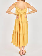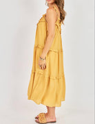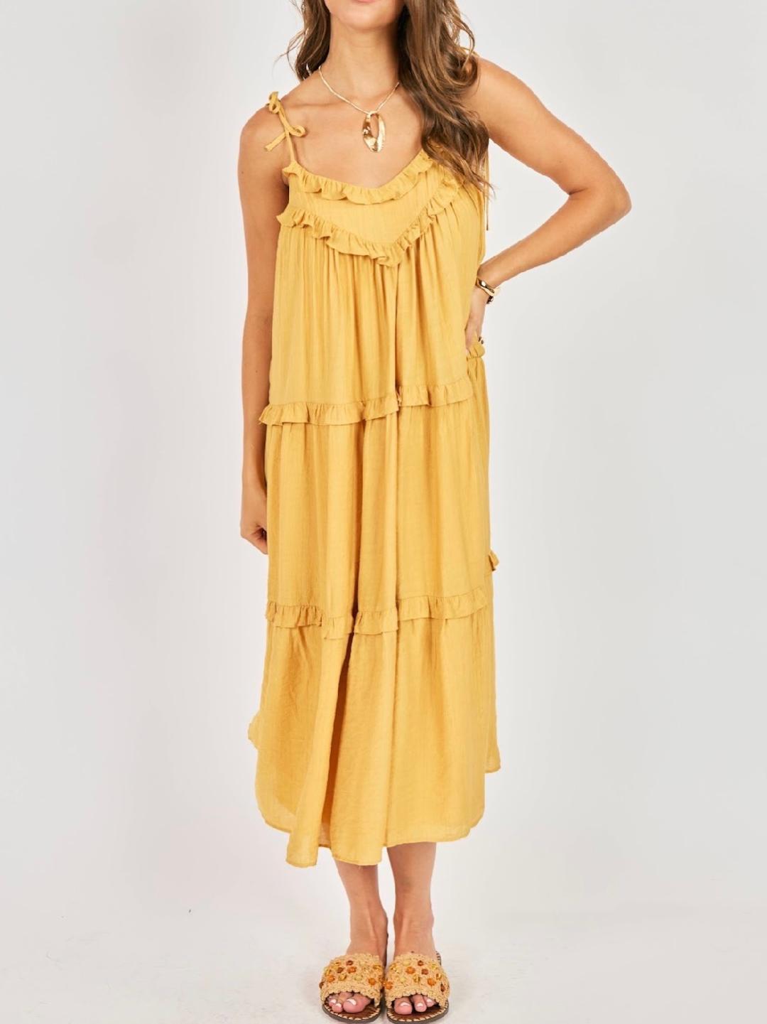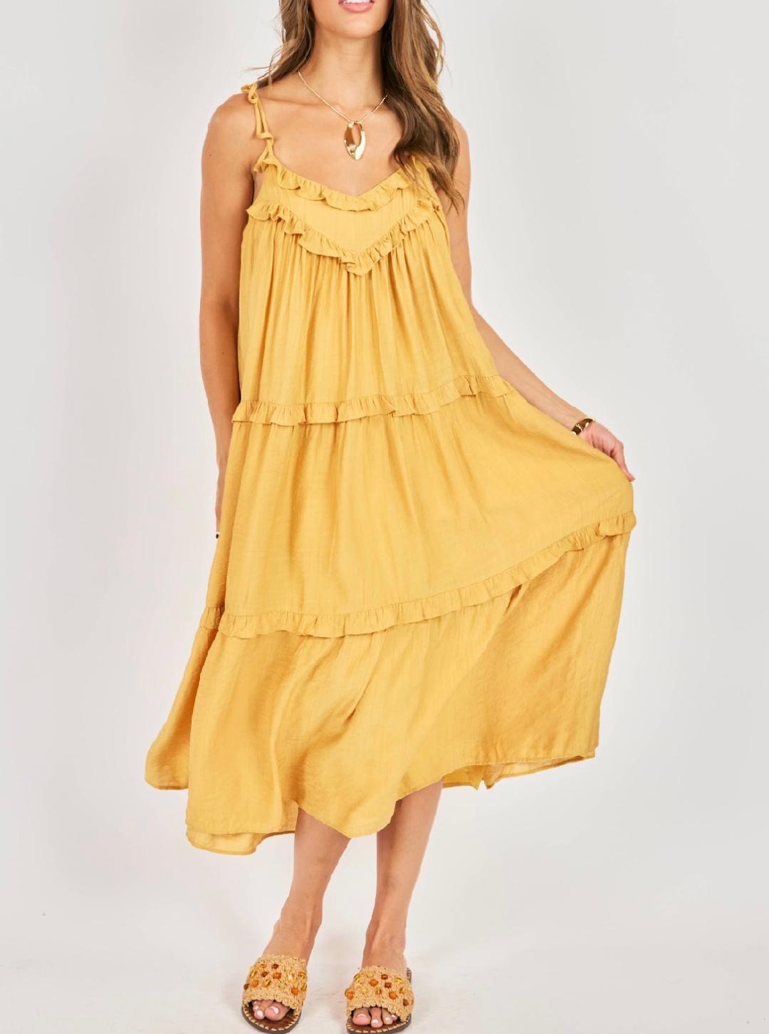 A breezy, sun-soaked midi dress in a warm honey-gold hue that instantly brightens your wardrobe. Designed with a relaxed, flowy silhouette, it features a soft V-neckline accented with delicate ruffle trim and adjustable tie straps for a customizable fit. The bodice falls effortlessly into tiered layers, each finished with subtle ruffle detailing that adds movement and dimension. Lightweight and airy, this dress drapes beautifully for an easy, flattering fit that’s perfect for warm days, vacations, or casual outings. Effortless, feminine, and endlessly wearable.