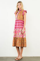 This patchwork floral midi dress is a true statement piece — vibrant, feminine, and full of personality. Designed with a mix of bold pinks, warm corals, and fresh greens, it features thoughtfully placed contrasting prints that create a beautifully layered look. The bodice combines two coordinating floral patterns, separated by a striped trim detail that adds a tailored touch. A ruffled mock neckline gives it a polished, elevated feel, while flutter sleeves with subtle striped edging add soft movement and charm. The waist is gently gathered, flowing into a tiered midi skirt with pockets and alternating prints that bring dimension and interest from every angle. The length hits below the knee for an easy, flattering silhouette that feels both playful and refined. Perfect for brunch, showers, or summer events, this dress stands out effortlessly — just add simple heels or sandals and let the print do the talking.