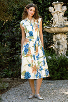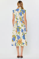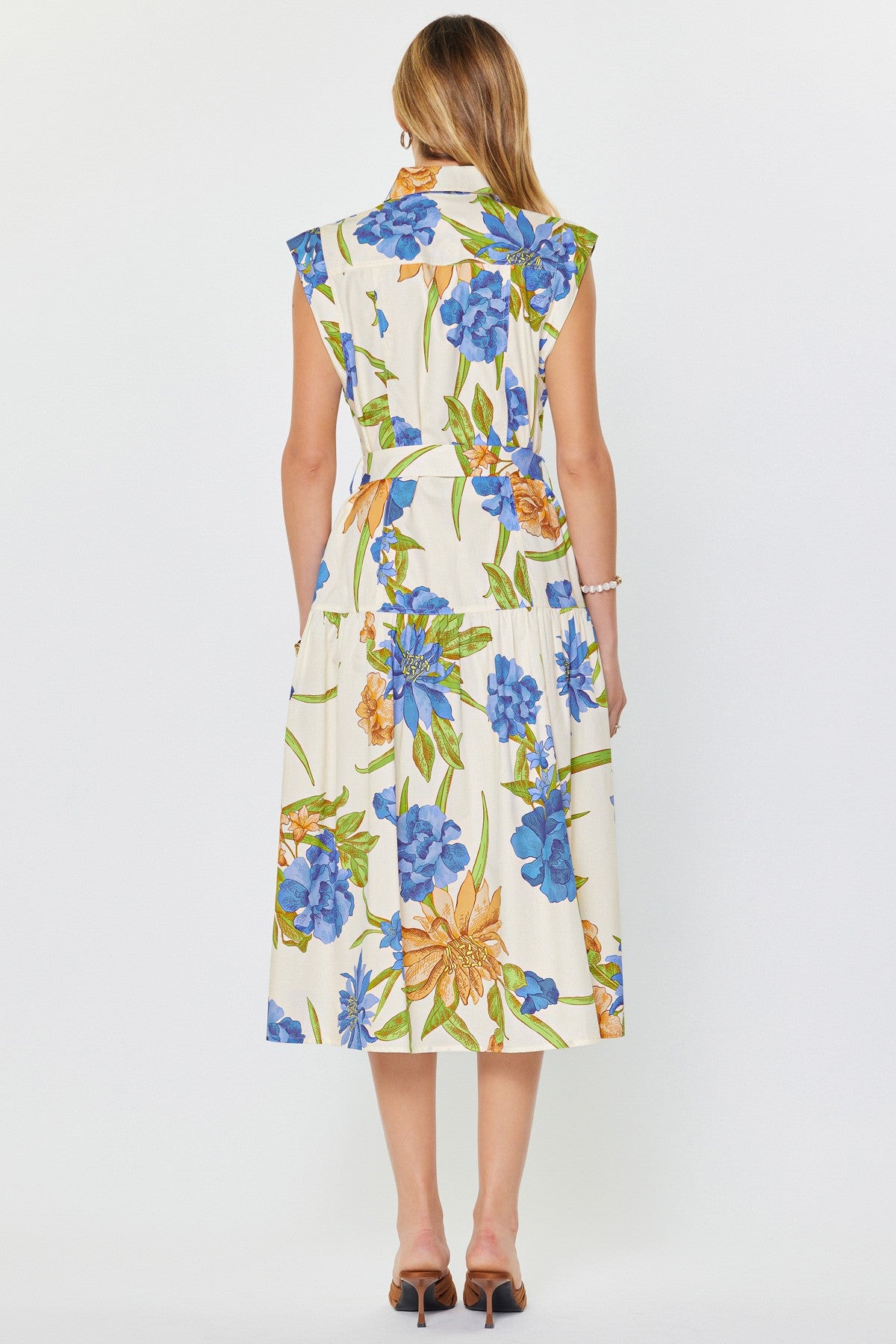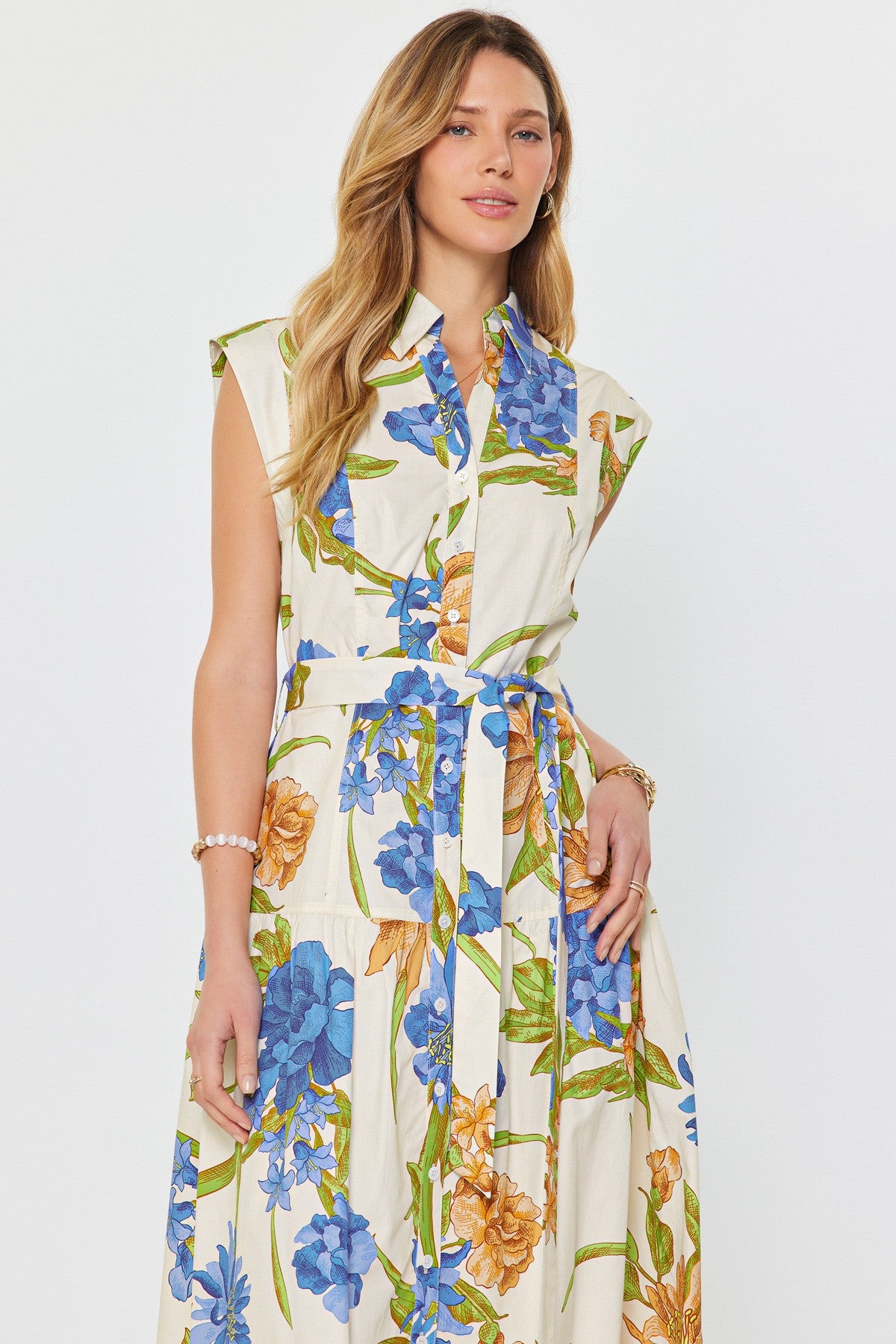A fresh, feminine take on a classic shirt dress, this floral midi is designed to make a statement while still feeling effortlessly wearable. Featuring a soft ivory base with vibrant blue and warm golden floral prints, it brings a beautiful, painterly feel to your everyday wardrobe. The structured shirt collar and button-down front add a tailored touch, while the removable self-tie belt cinches the waist for a flattering, customizable fit. A drop waist seam flows into a softly gathered skirt, giving it that easy, breezy movement you’ll love. Cap sleeves keep the silhouette modern and polished, making it perfect for everything from casual days, work to elevated outings.
