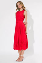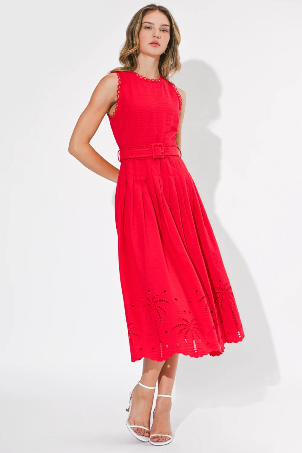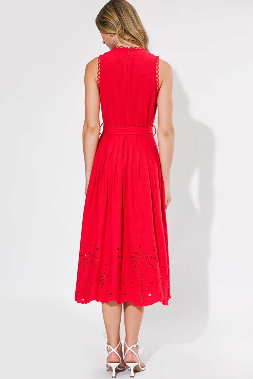 A statement-making midi dress in a vibrant, eye-catching red, designed to turn heads with every step. Featuring a sleeveless silhouette and a high neckline, this piece is accented with delicate scalloped trim along the armholes and neckline for a feminine touch. The fitted bodice flows into a beautifully pleated skirt, creating soft movement and an effortlessly flattering shape. A matching belt cinches the waist for a defined, polished finish. Intricate palm-inspired eyelet embroidery along the hem adds texture and detail, while the scalloped edge completes the look. Finished with a back zipper closure, this dress is perfect for summer events, vacations, or any moment that calls for something bold and refined.
