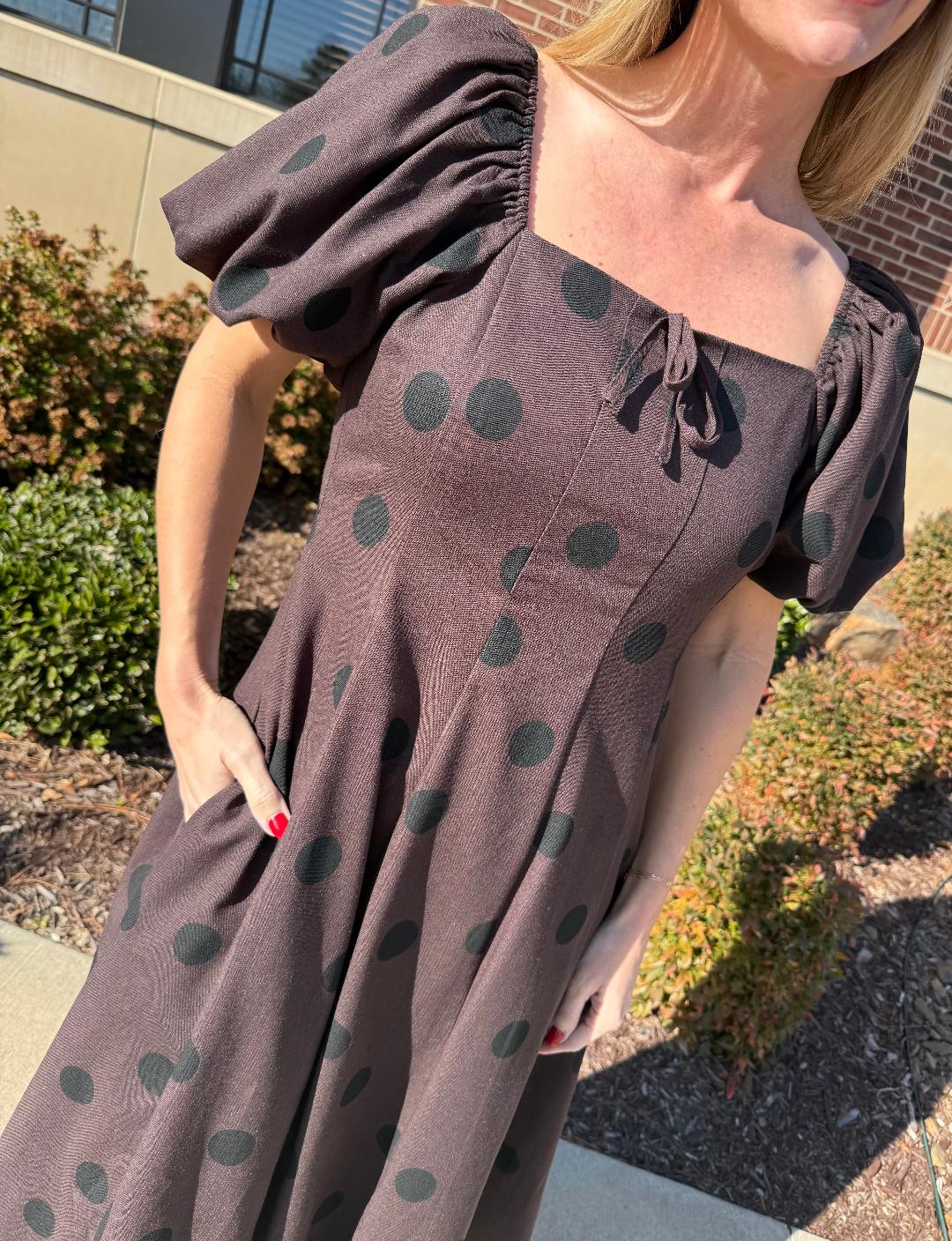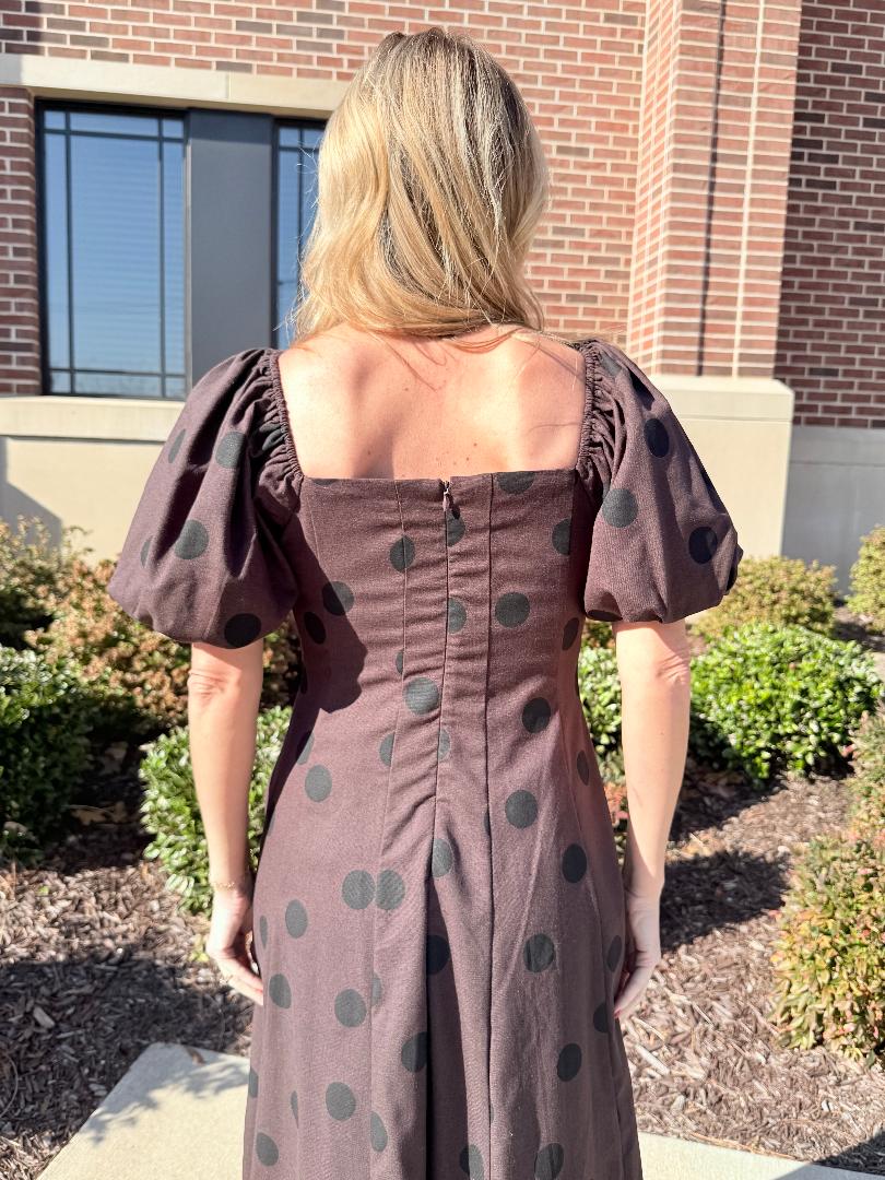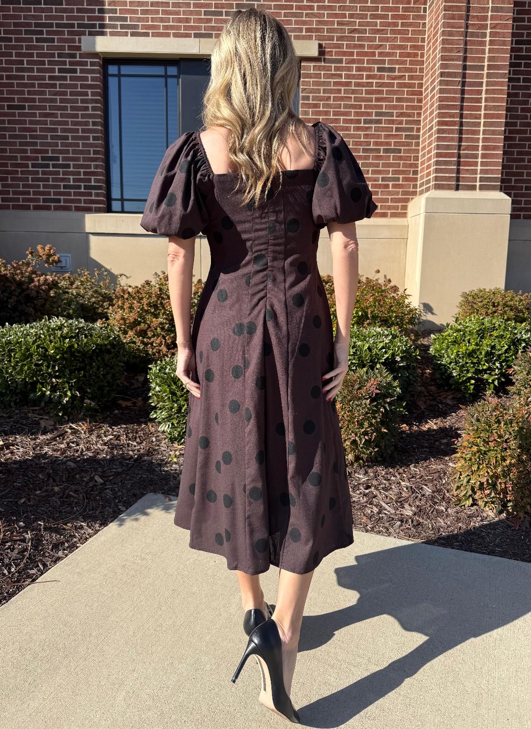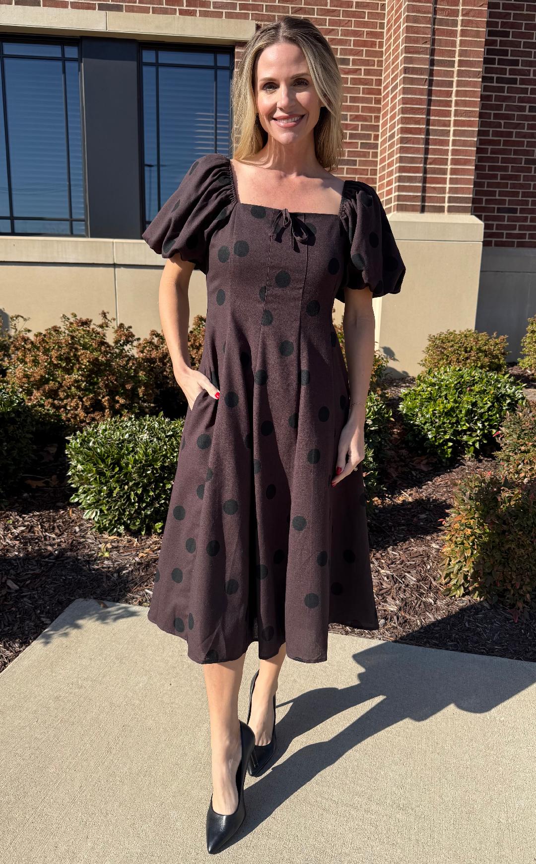 This timeless midi dress blends classic charm with modern femininity. Designed in a rich chocolate-brown hue with subtle black polka dots, it features a softly structured square neckline and voluminous puff sleeves that add just the right amount of drama. The fitted bodice flows into an easy A-line skirt that hits at a flattering midi length, creating beautiful movement with every step. Finished with side pockets and a clean back zipper, this dress feels polished yet effortless—perfect for dinners, events, or styled casually with boots or flats for daytime.