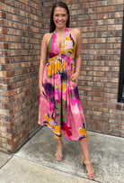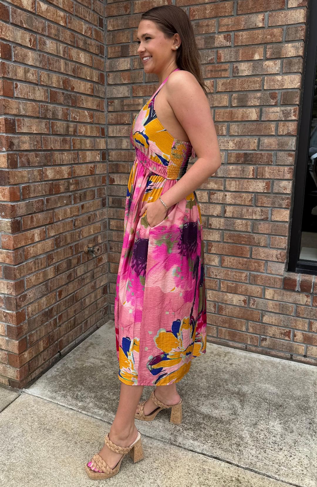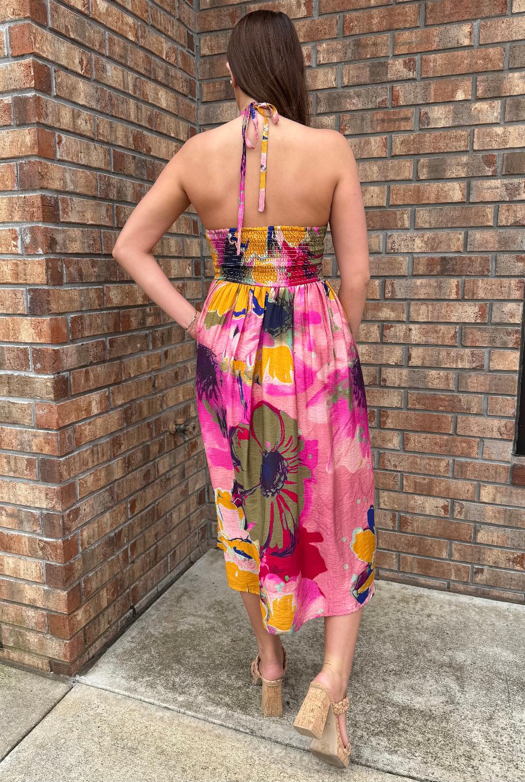 Turn heads and brighten any room in the Piper Halter Midi Dress. This vibrant floral midi features a kaleidoscope of sunset-inspired hues—pinks, purples, mustard yellow, olive green, and deep navy—swirled into an abstract floral print that feels like summer on fabric. The halter neckline and smocked bodice offer a flattering, secure fit, while the flowy skirt and hidden pockets bring comfort and ease. Whether you're vacation-bound, brunching with friends, or dancing barefoot at a garden party, this dress brings the fun.
