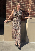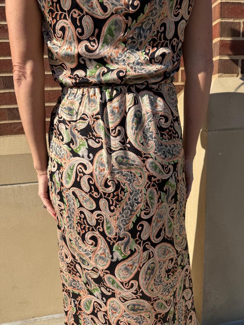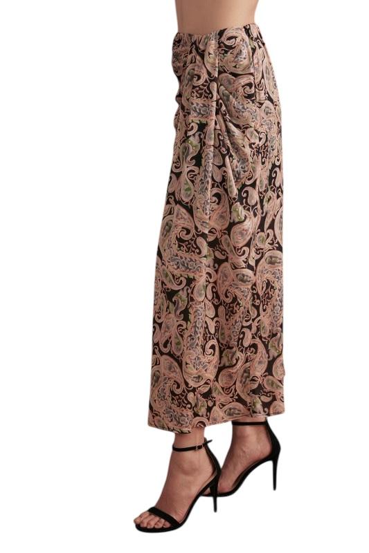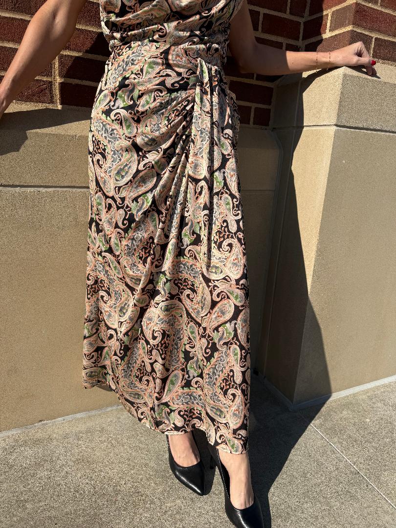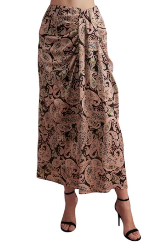 This statement midi skirt features a rich paisley print with smooth, fluid movement and an elegant draped front detail that creates a flattering, wrapped look without the fuss. Designed with a comfortable elastic waistband, it slips on easily while still offering shape through the hips. The lightweight, silky fabric drapes beautifully and hits at a versatile midi length, making it perfect for dressing up with heels or styling more casually with boots or flats. Polished, feminine, and effortless—this is the kind of skirt that does all the work for you. Style with a solid black top or our matching Posh Draped Neckline Sleeveless Top.