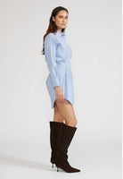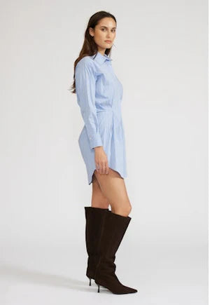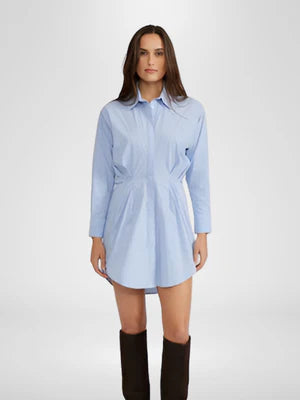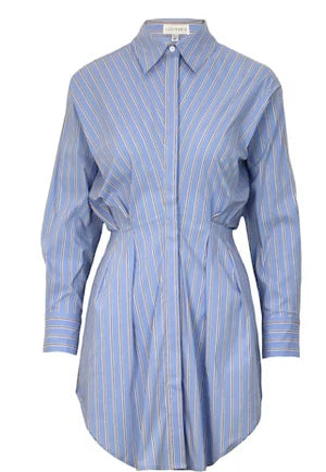 This shirt dress has a crisp and tailored look with a playful twist. Made from a lightweight striped fabric in soft blue with fine contrasting white, charcoal and subtle orange lines, it features a classic collared neckline and button-down front. The design cinches slightly at the waist with subtle pleating, creating a flattering shape that flows into a relaxed, shirttail hemline. Long sleeves with buttoned cuffs add polish, while the mini length keeps it fresh and modern. Perfect for styling on its own with boots for an effortlessly chic outfit, or layered under knits and jackets for transitional weather.