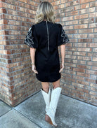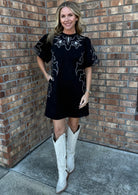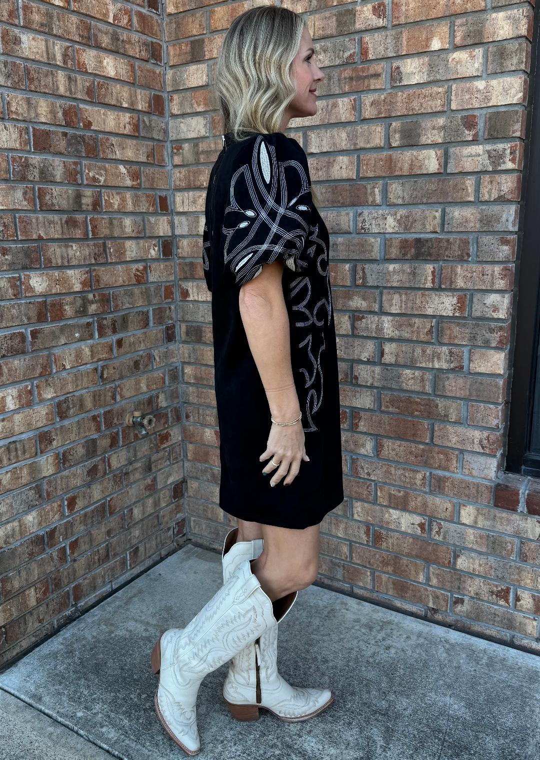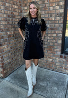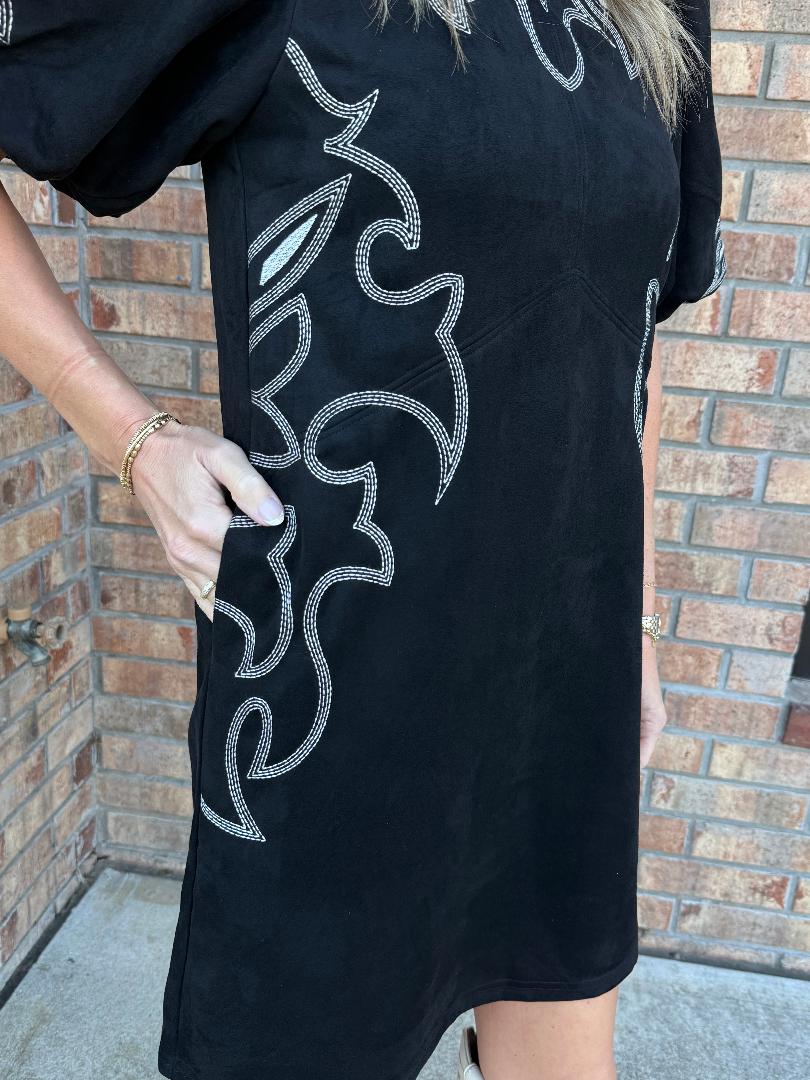 This Embroidered Suede Shift Dress delivers effortless sophistication with a touch of western-inspired flair. Crafted from soft faux suede in a rich black hue, it features intricate ivory embroidery that adds striking contrast and texture throughout the bodice and sleeves. The silhouette is a relaxed shift shape with short puff sleeves and a back zip closure, offering an easy, flattering fit. Side pockets add a practical and modern touch. Perfectly styled with tall western boots for a day-to-night look, this dress transitions seamlessly from fall events to holiday gatherings. Pair it with statement earrings or a fringe bag for the ultimate chic, southern-inspired ensemble.