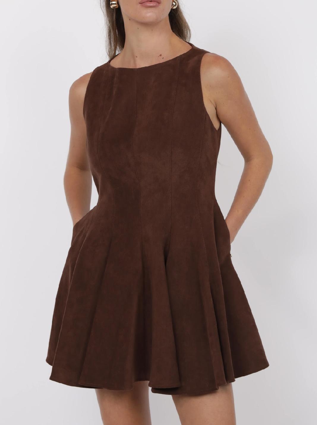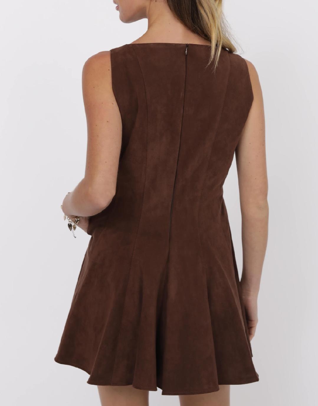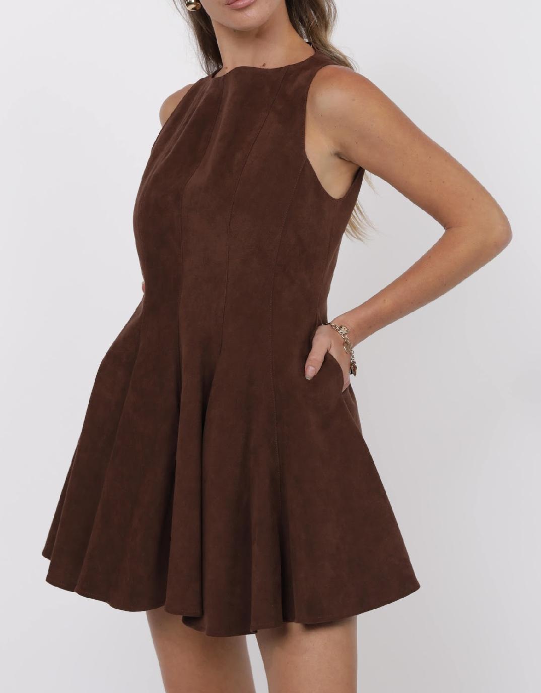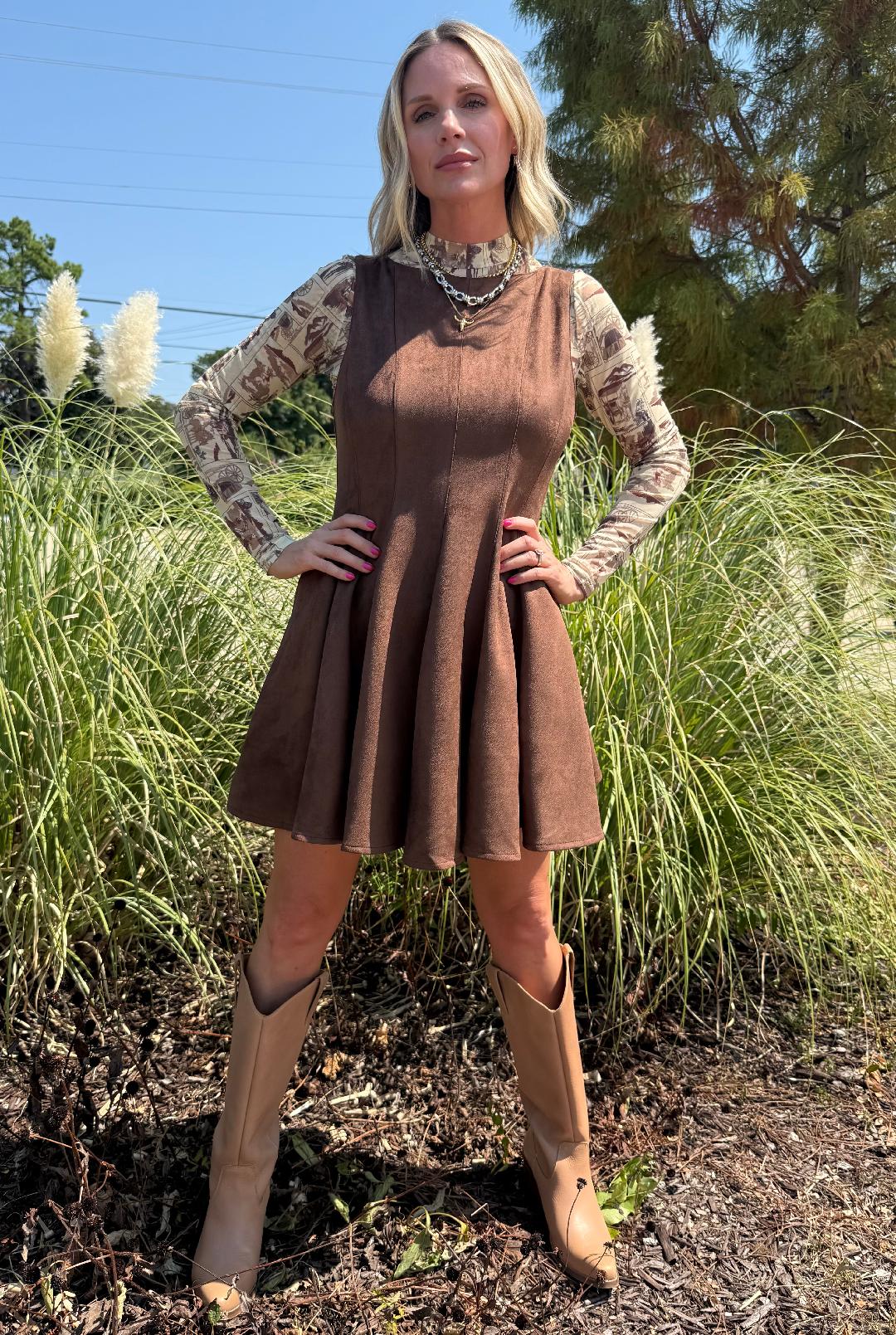 Channel vintage Western charm with this rich chocolate-brown suede dress. Crafted in a sleeveless silhouette, it features a flattering fit-and-flare shape with structured seams through the bodice that give playful movement on the skirt. The soft faux suede fabric gives it a luxe, tactile feel, while hidden side pockets add the perfect touch of practicality. Finished with a back zipper closure, this piece is both chic and versatile—style it with boots for a Western-inspired look or elevate it with heels and statement jewelry. Shown layered over our Giddy Up Mesh Top.