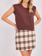 Classic fall style with a modern edge — the Manhattan Hush Plaid Mini Skirt is a must-have for the season. Designed in a cozy flannel-like fabric, this skirt features a timeless plaid pattern in warm cream, brown, and gray tones. The structured silhouette offers a flattering fit that pairs perfectly with tall boots or tights. Soft to the touch and fully silky lined for comfort, it’s an effortless piece that transitions seamlessly from day to night. Shown styled with our Giselle Brown Sweater Vest.