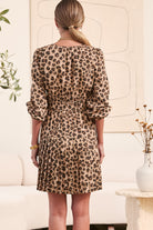 A little wild, a little glam—this leopard print mini dress brings the perfect balance of fierce and feminine. Featuring a flattering v-neckline, smocked waist with drawstring detail, and breezy tiered skirt with pleats for added movement. The billowy sleeves and smooth fabric elevate the look for daytime chic or an easy night out. Add gold accessories and you're set to prowl in style.